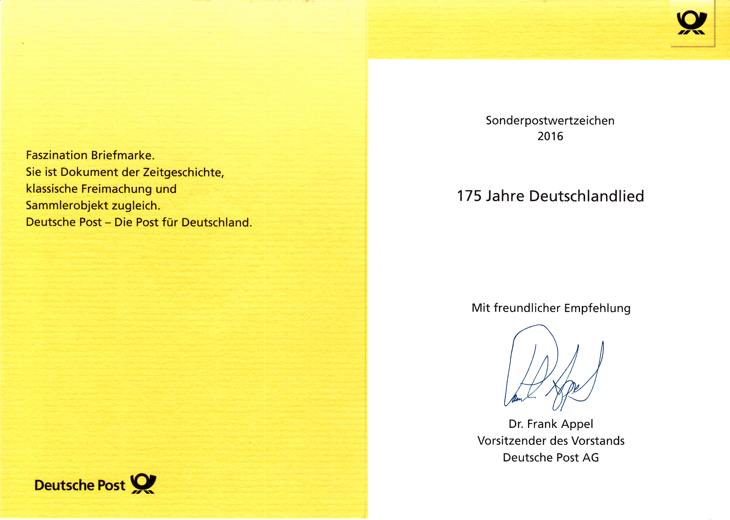 Ergänzend zu der bereits früher gezeigten Ministerkarte folgt jetzt die Klappkarte des Vorsitzenden des Vorstandes der Deutschen Post AG mit der Marke "175 Jahre Deutschlandlied", die mit dem Bonner Ersttagsonderstempel gestempelt ist.