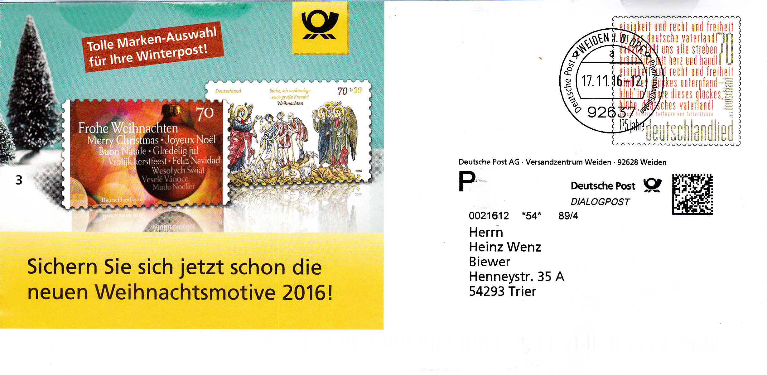 Faltbrief 210 mm x 102 mm als Eigenausgabe der DP AG - mit Postlogo mit Wertstempel der 70C-Marke "175 Jahre Deutschlandlied" (MiNr 3263) mit aufgedruckter Zähnung und Vorausentwertung "Deutsche Post (Posthorn) WEIDEN I.D.OPF (Posthorn) Privatkunden/Filialen / a / 17.11.16-12".