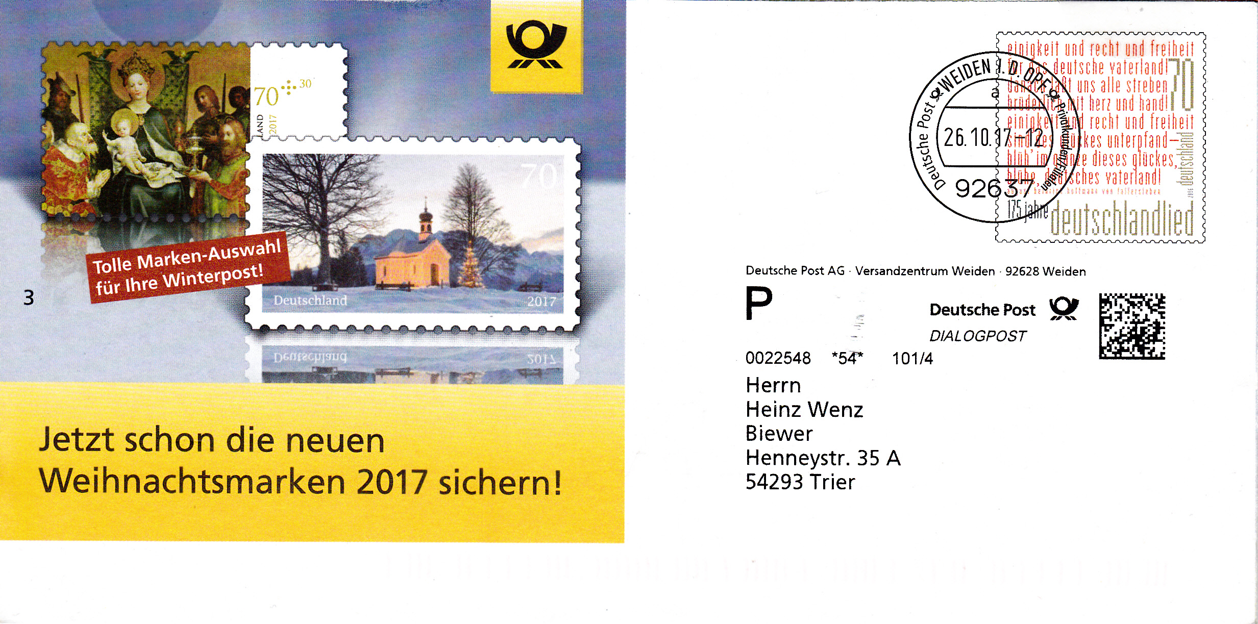 Faltbrief 210 mm x 102 mm mit Wertstempel der 70C-Marke mit der Zeichnung "175 Jahre Deutschlandlied" (MiNr 3263) mit aufgedruckter Zähnung und Vorausentwertung "Deutsche Post (Posthorn) WEIDEN I.D.OPF (Posthorn) Privatkunden/Filialen / a / 26.10.17-12".