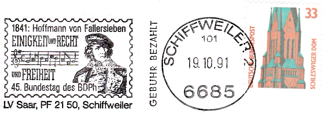 Absenderentwerter des Landesverbandes Saar auf einer Massendrucksache vom 19.10.1991zum Jubiläum " 150 Jahre Deutschlandlied" und zum 45. Bundestag des BDPh in Saarbrücken.