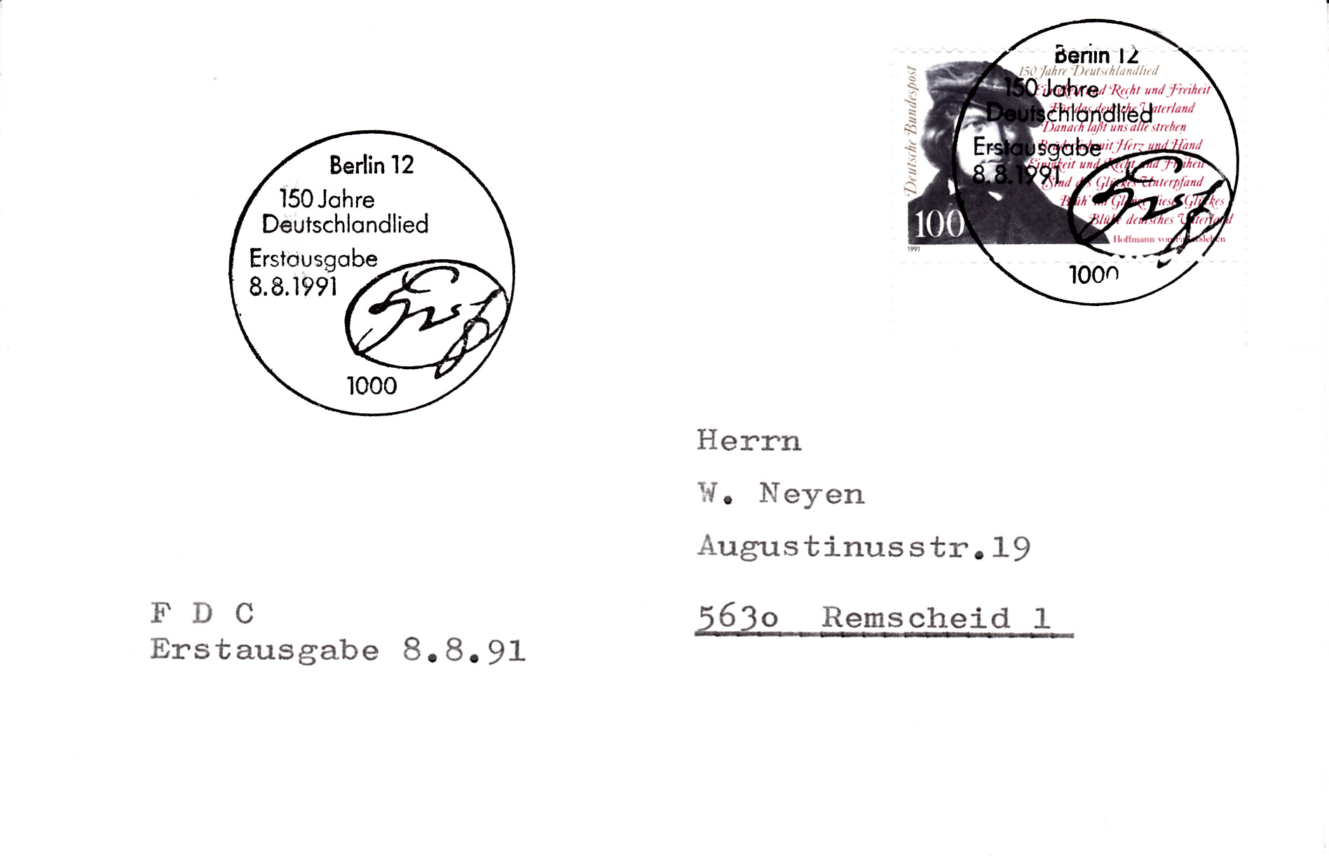 Die zu Beginn dieses Themas gezeigte Marke zum Jubiläum "150 Jahre Deutschlandlied" ist hier auf einem gelaufenen Ersttagsbrief mit dem Ersttagsonderstempel Berlin entwertet worden.