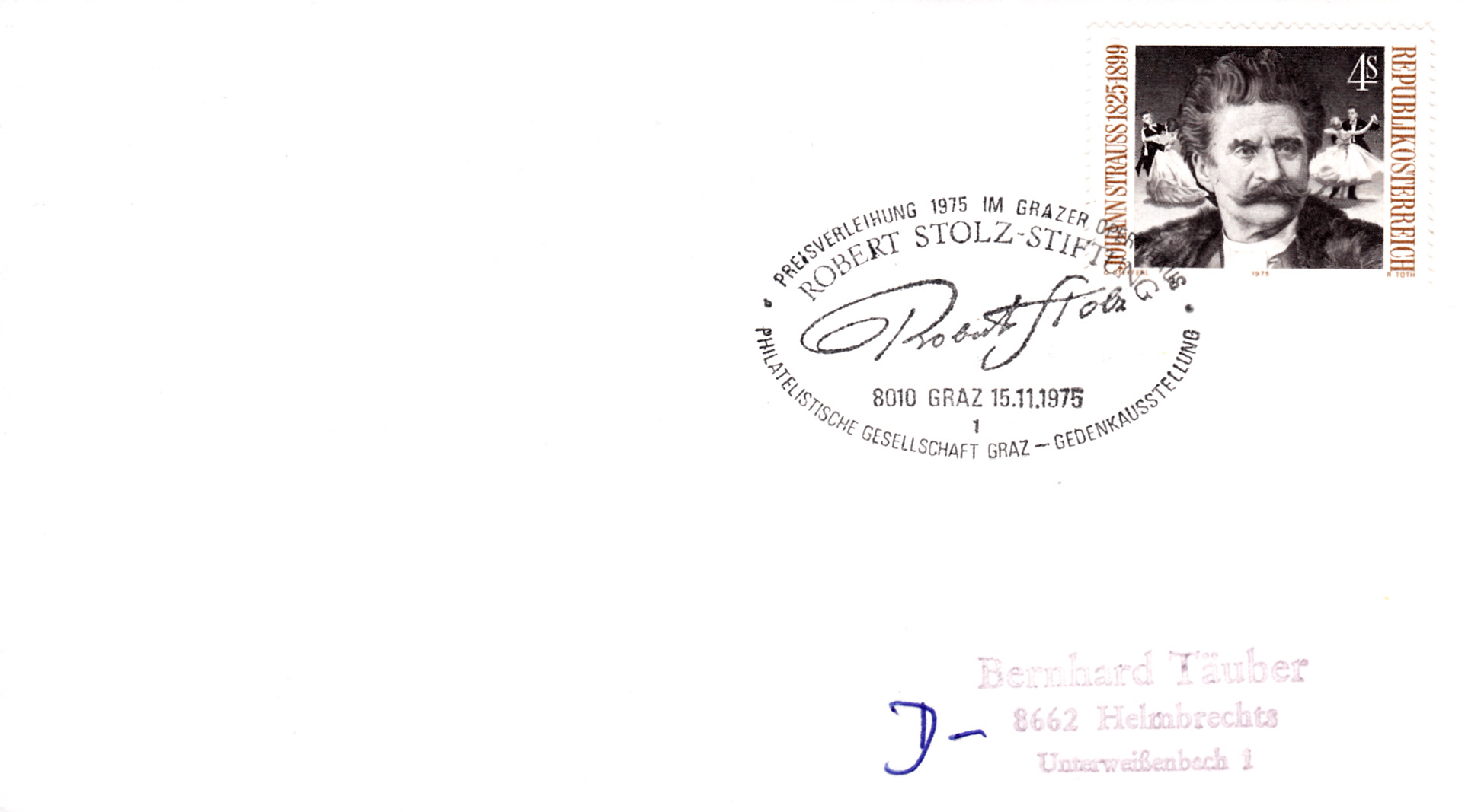 Sonderstempel aus Graz vom 15.11.1975 zur Preisverleihung der Robert Stolz-Stiftung im Grazer Opernhaus. Im Stempel wird die Unterschrift von Robert Stolz gezeigt.