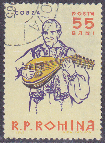Auf dieser Marke aus Rumänien (MiNr 2000) sehen wir einen Kobsaspieler mit einer rumänischen Knickhalslaute.