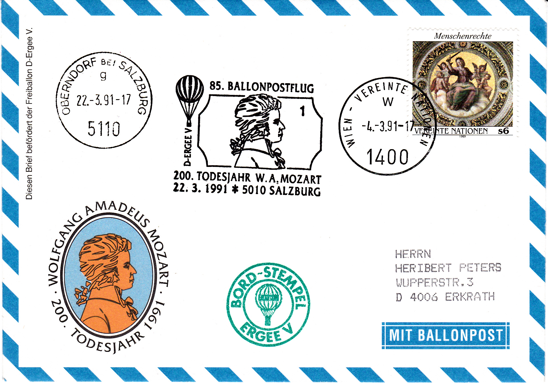 Und er trägt einen Ankunftsstempel aus Salzburg mit einer Abbildung von W.A. Mozart und der Kennziffer "1".