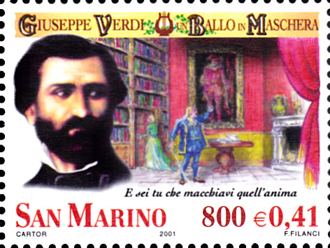 Diese Marke (MiNr 1944) zeigt eine Szene aus der Oper "Ein Maskenball", die am 17. Februar 1859 in Rom, im Teatro Apollo uraufgeführt wurde.