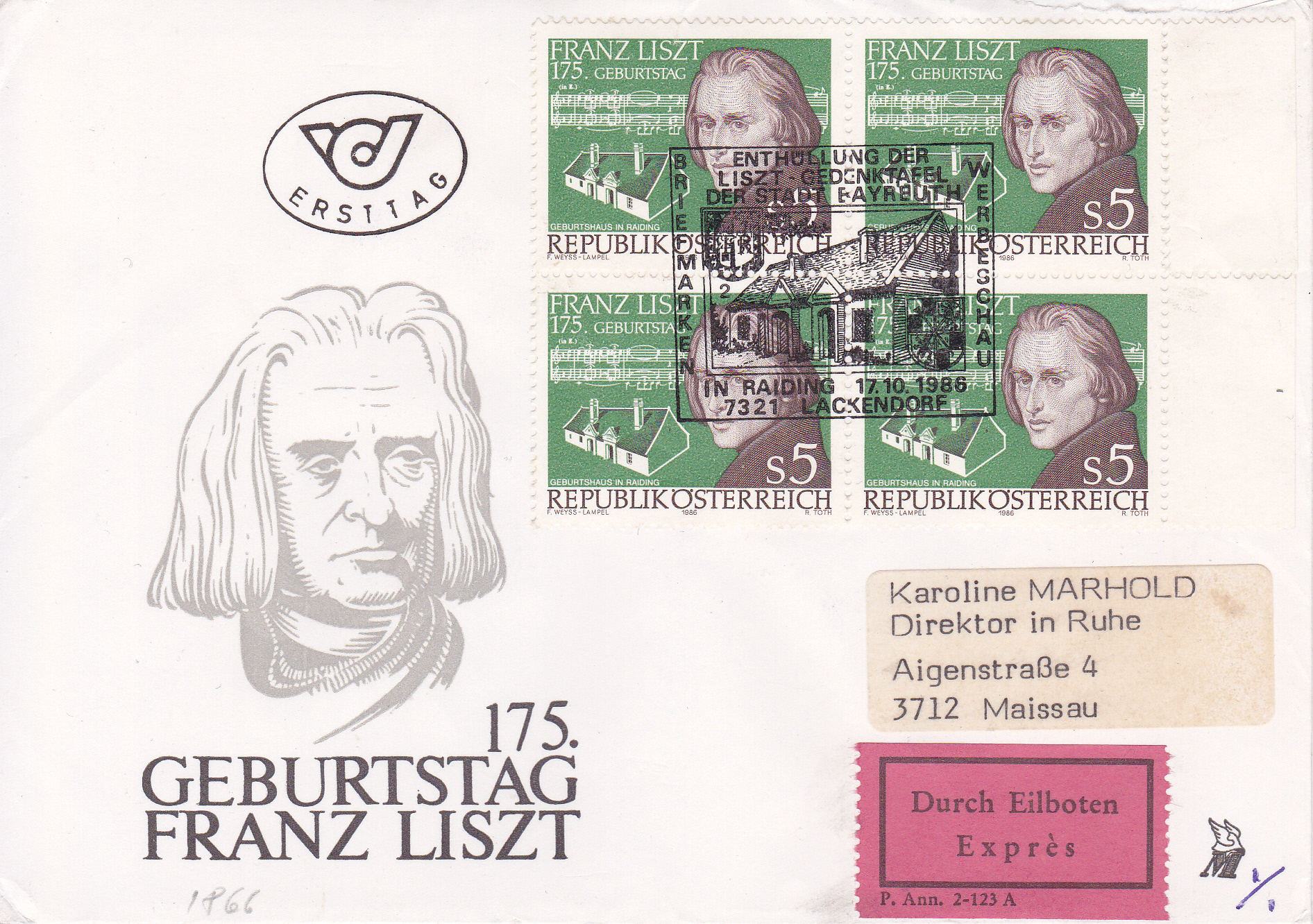 Brief mit Eilboten vom Ersttag mit Mehrfachfrankatur der Marke aus Österreich (MiNr 1866) zum 175. Geburtstag von Franz Liszt und dem Sonderstempel vom 17.10.1986 aus Lackendorf zur Enthüllung einer Liszt-Gedenktafel. Das Porto betrug für den Brief bis 20 Gramm 5 Schilling und für Eilboten 20 Schilling, zusammen also 25 Schilling.
