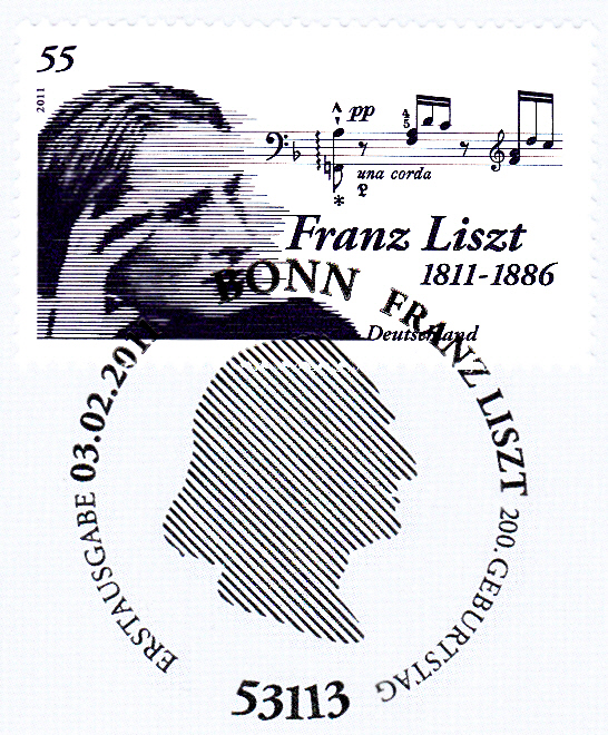 Diese Marke zum 200. Geburtstag von Franz Liszt der Deutschen Post eine Marke (MiNr 2846) ist mit dem Ersttagsonderstempel Bonn gestempelt.