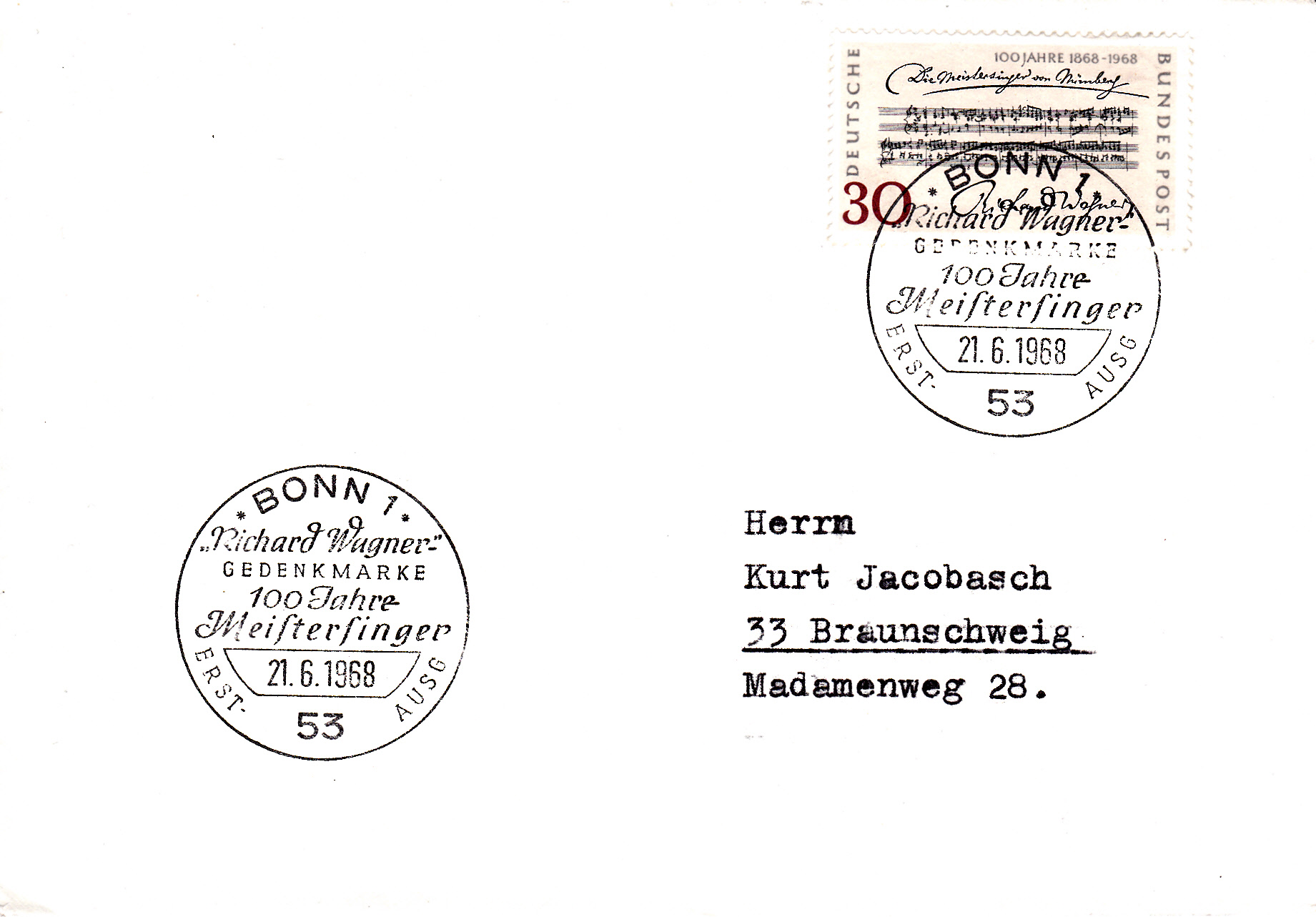Die Marke "100 Jahre Meistersinger" wurde hier auf einem Brief mit dem Ersttagsonderstempel Bonn abgestempelt.