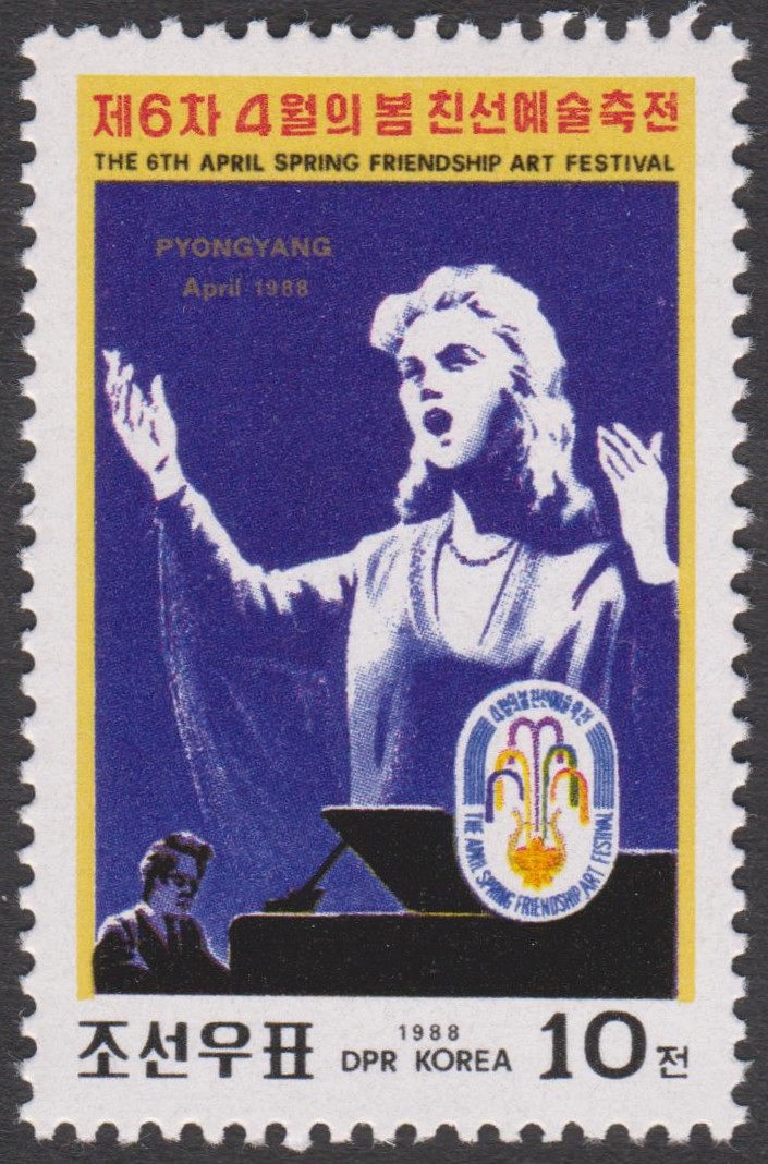 Nordkorea MiNr. 2908 erschien am 07.04.1988 zum 6. Kunstfestival der Freundschaft und zeigt einen Pianisten, der eine Sängerin am Flügel begleitet: