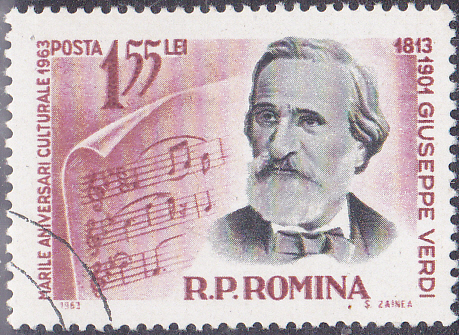 Diese Marke aus Rumänien (MiNr 2169) erinnert an den 150. Geburtstag von Giuseppe Verdi.