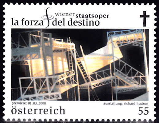 Zur Neuinszenierung der Oper "Die Macht des Schicksals" von Giuseppe Verdi an der Wiener Staatsoper erschien diese Marke in Österreich (MiNr 2716). Sie zeigt das Bühnenbild von Richard Hudson zur Oper "Die Macht des Schicksals" von Giuseppe Verdi.