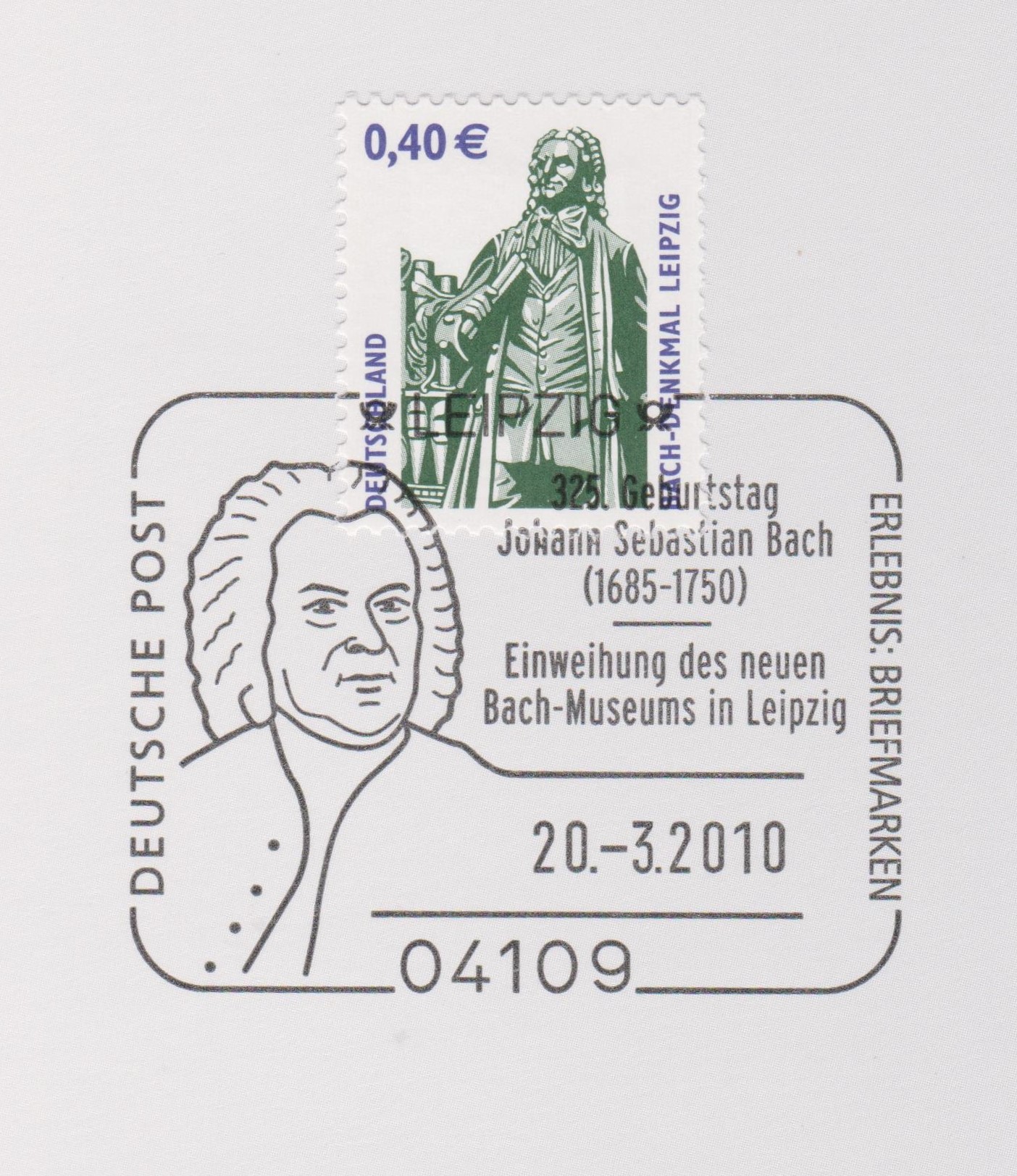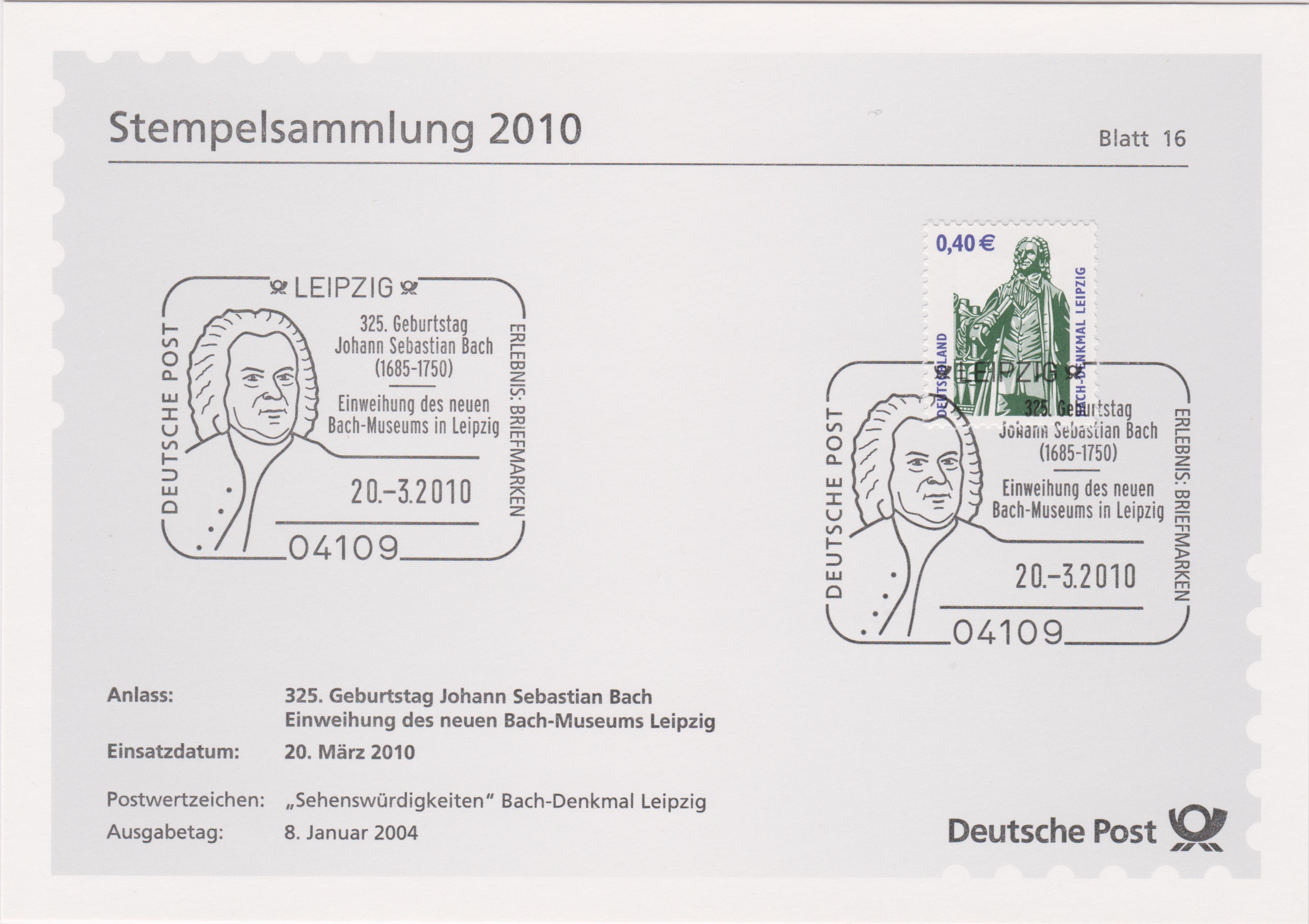 Die Wertstufe 0,40 € der Dauerserie Sehenswürdigkeiten, MiNr. 2375, zeigt das Bach-Denkmal in Leipzig. Auf Blatt 16 der Deutsche Post Stempelsammlung 2010 wurde dieses Postwerzeichen mit einem thematische perfekt passenden Sonderstempel versehen: