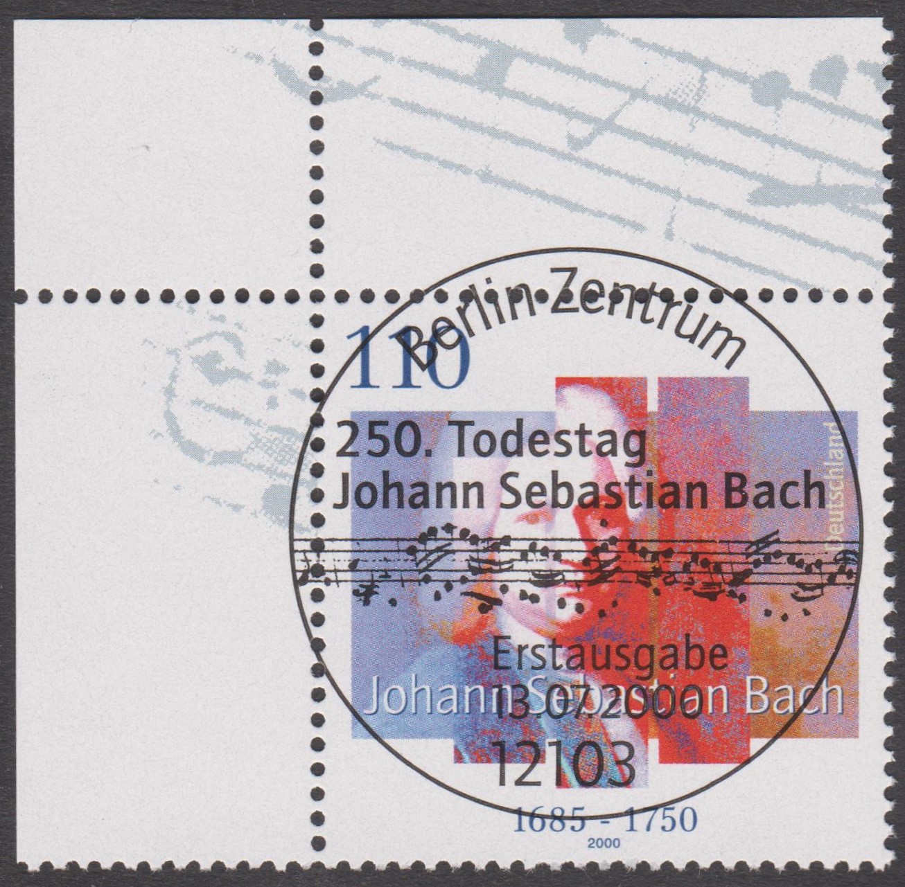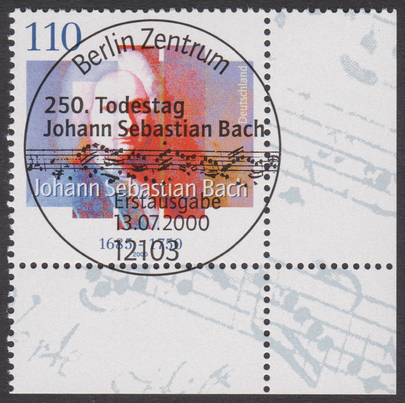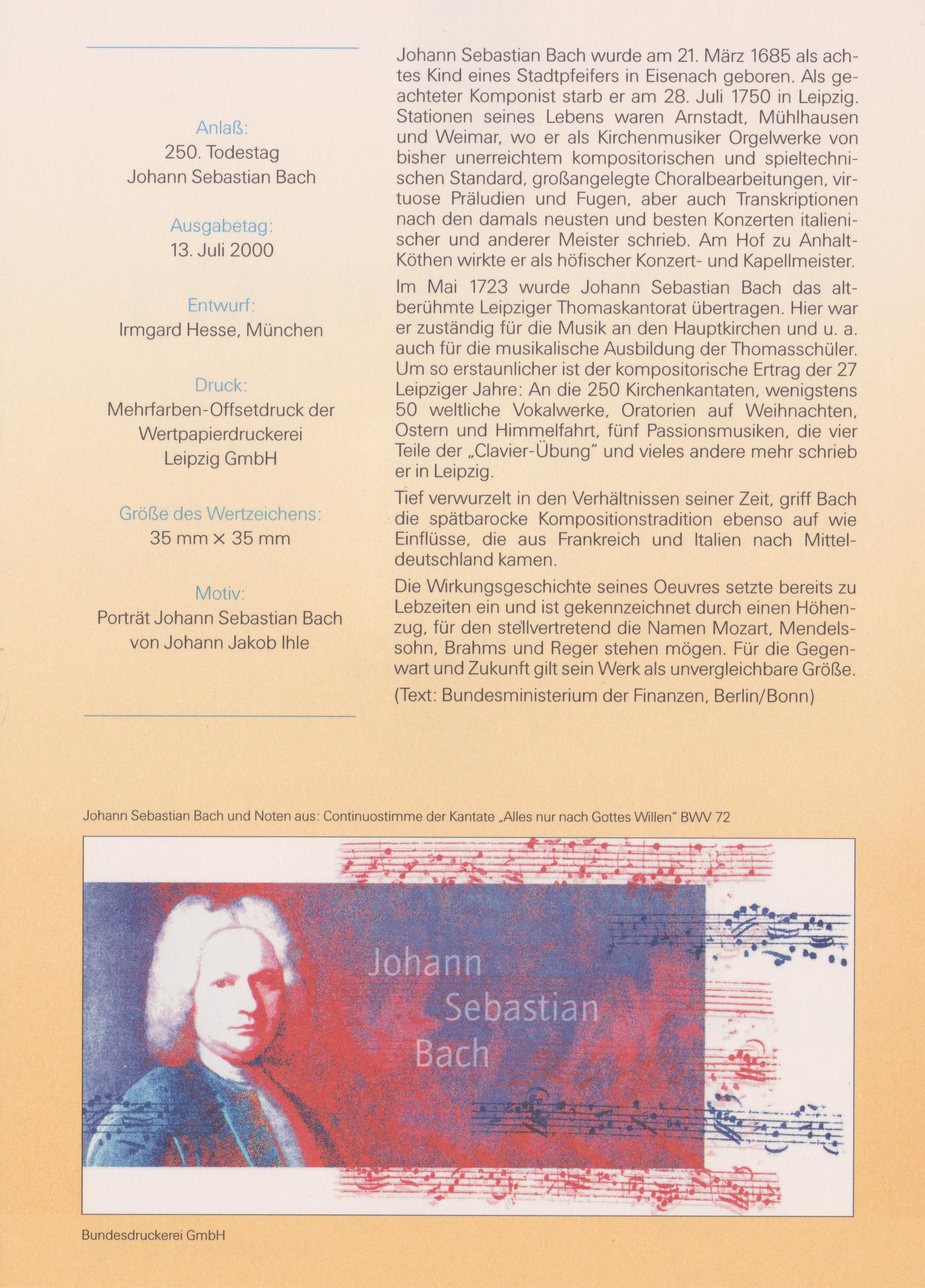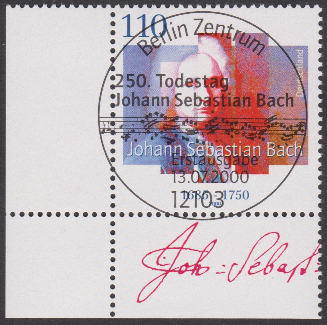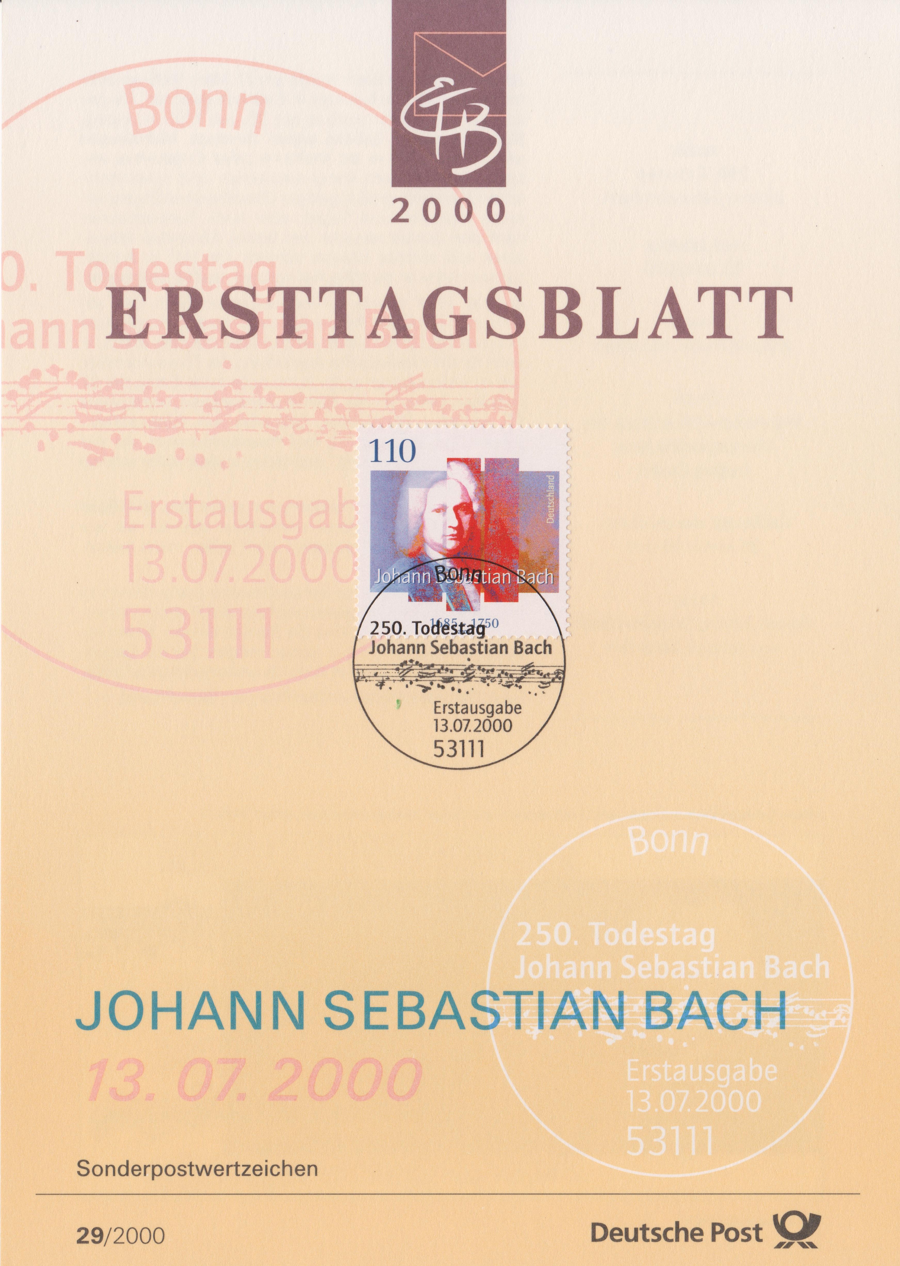 Im Jahr 2000 erschien bei der Deutschen Post ein Postwertzeichen zum 250. Todestag von Johann Sebastian Bach, MiNr. 2126, hier Ersttagsblatt 29/2000 mit Ersttagsonderstempel Bonn: