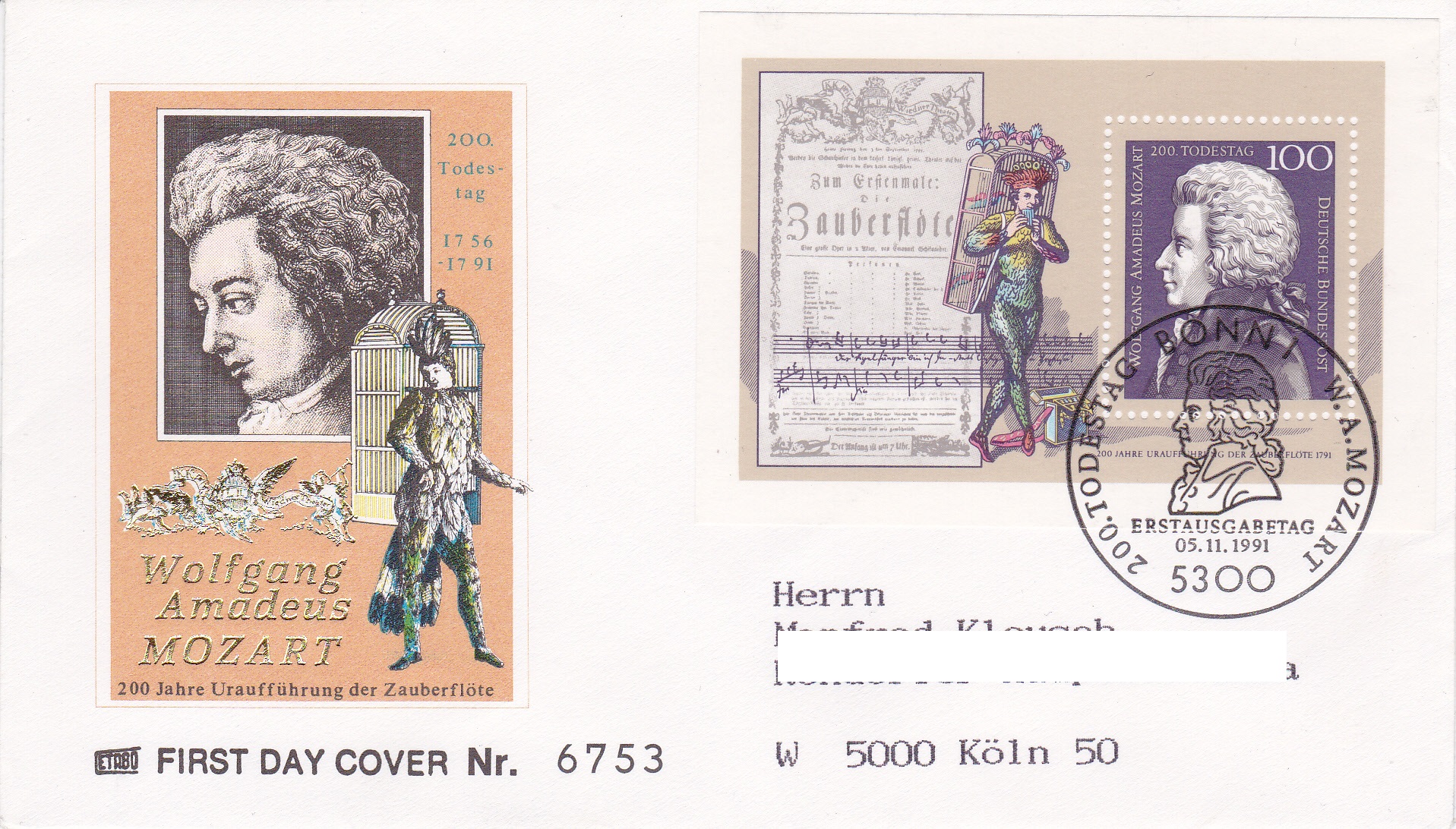 Der bereits gezeigte Block der Deutschen Bundespost zum 200. Todestag Mozarts (MiNr Block 26) ist hier auf einem Brief vom Ersttag mit dem Ersttagsonderstempel Bonn gestempelt worden.
