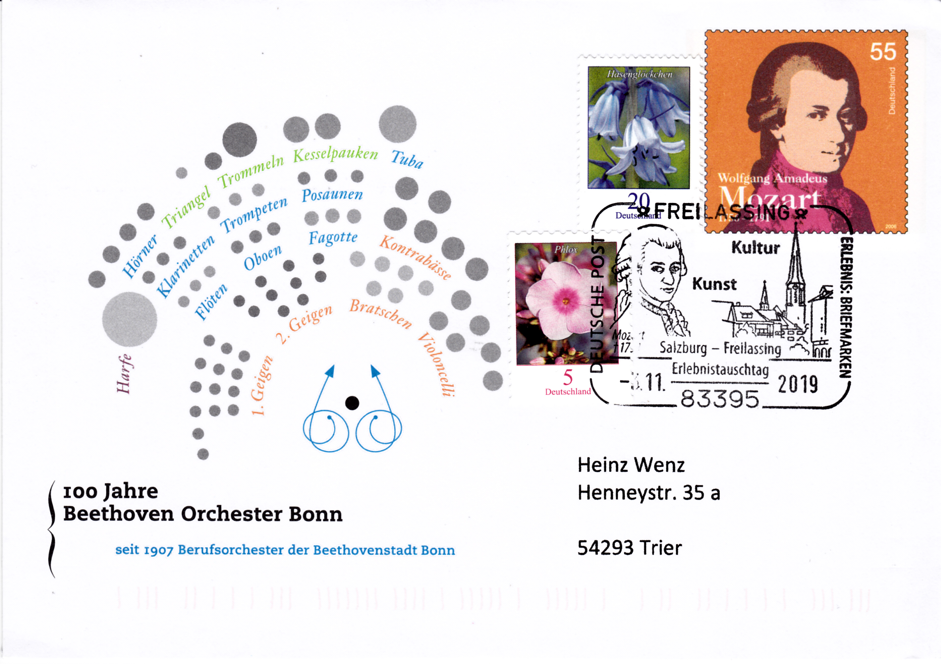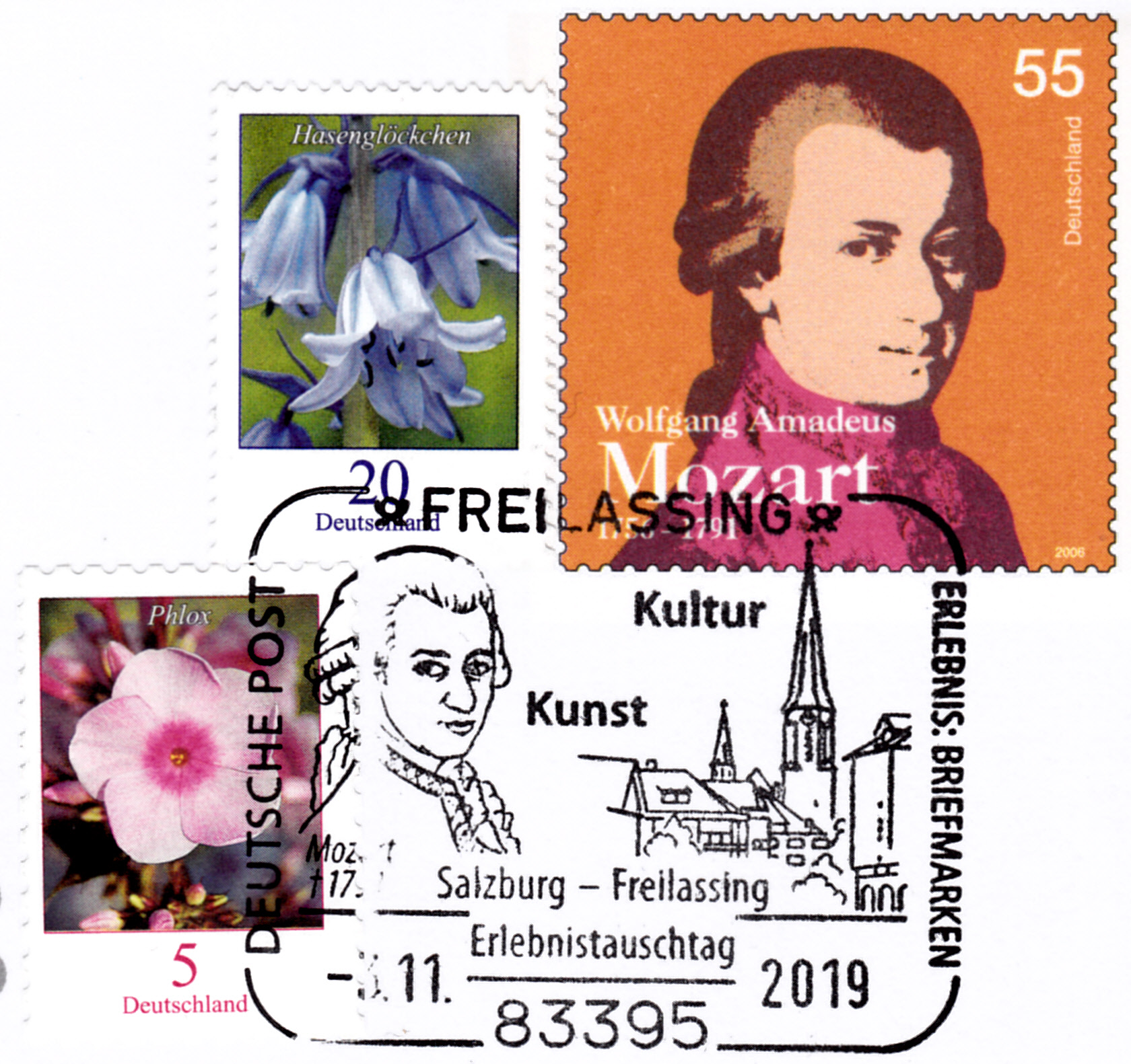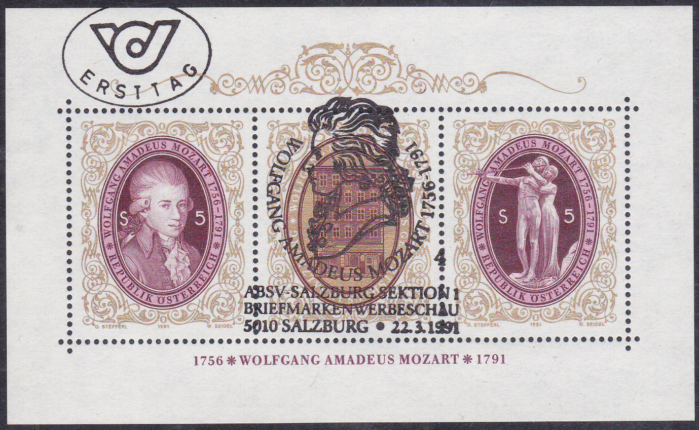 Der bereits auf Brief gezeigte Block aus Österreich zum 200. Todestag von Wolfgang Amadeus Mozart (MiNr Block 10) wurde bei diesem Exemplar in Salzburg mit einem Sonderstempel am Ausgabetag gestempelt. Im Stempelbild wird Mozart von der Seite gezeigt.