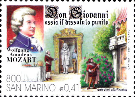 In San Marino ist in der Ausgabe "400 Jahre Oper" eine Marke (MiNr 1815) zu Ehren von Wolfgang Amadeus Mozart erschienen. Auf der Marke werden ein Porträt von Wolfgang Amadeus Mozart und eine Szene aus der Oper "Don Giovanni" gezeigt.