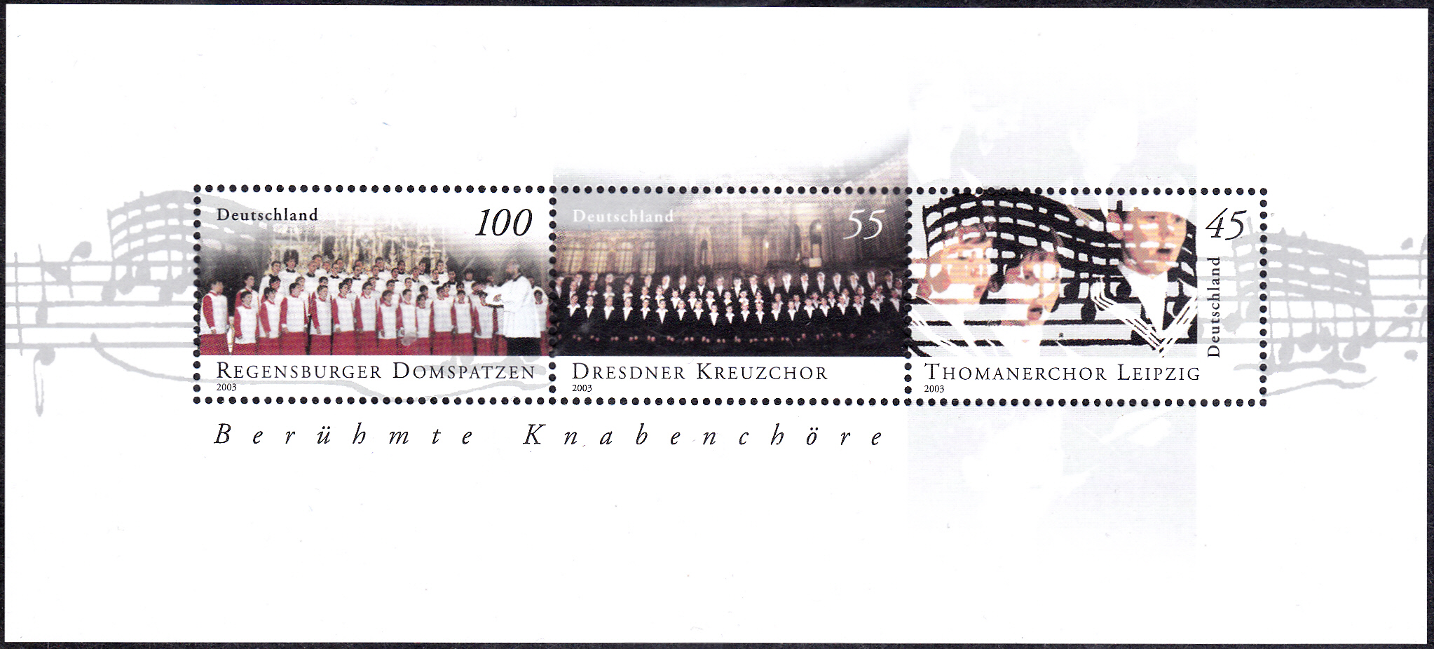 Diese Marken wurde zusammen mit zwei weiteren Marken in einem Block "Berühmte Knabenchöre" (MiNr Block 61) gedruckt. Hier zeige ich einen postfrischen Block.