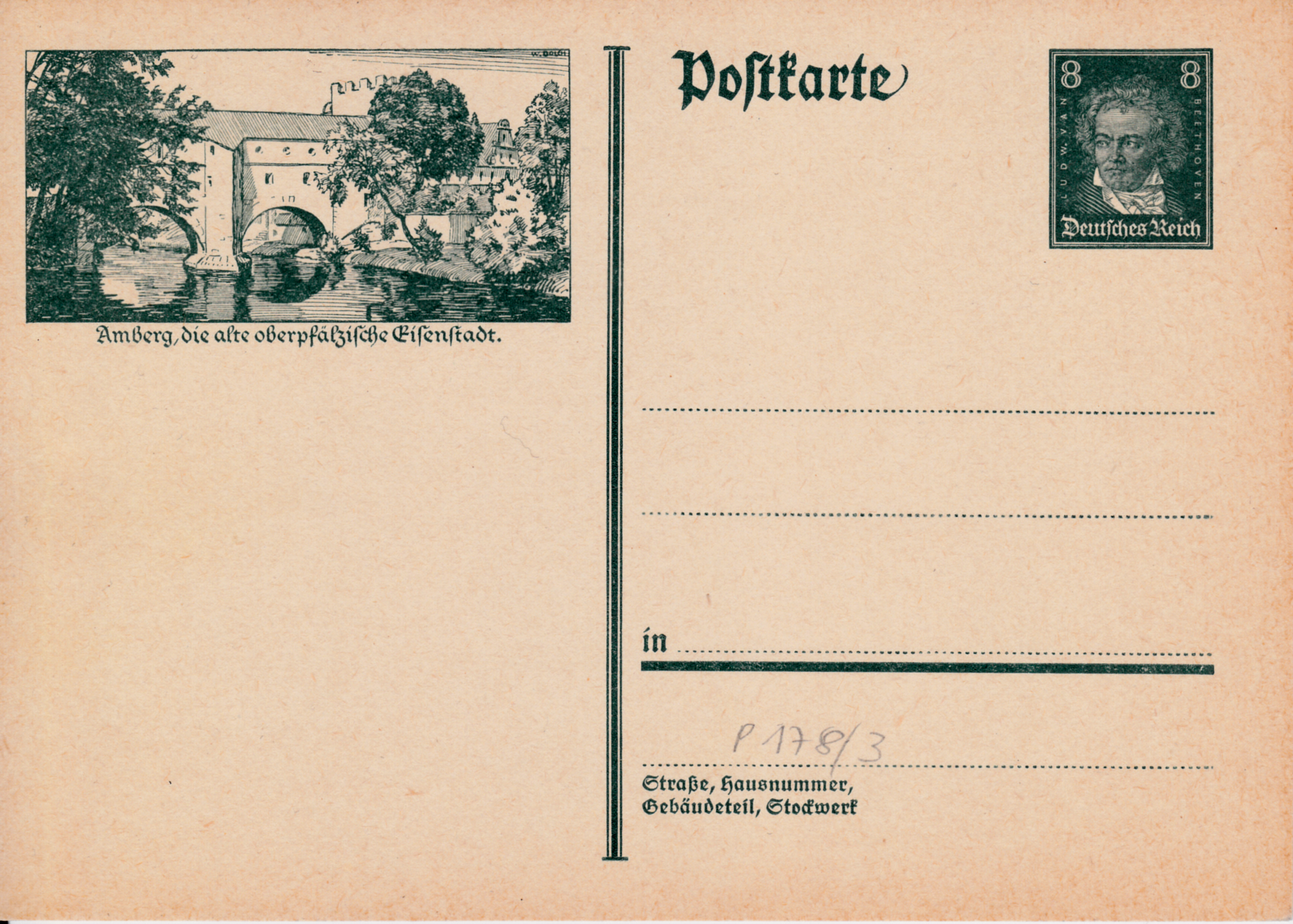 Die Bildpostkarten 1927 (MiNr P 178) mit dem Wertstempel "Berühmte Deutsche" mit dem Porträt von Ludwig van Beethoven ist mit insgesamt 27 verschiedenen Bildern erschienen. Hier zeige ich die Karte MiNr P 178/01 mit einer Abbildung aus Adenau (Nürburgring).