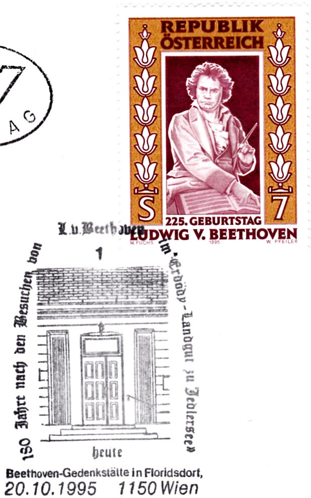 FDC mit der Marke aus Österreich zum 225. Geburtstag von Ludwig van Beethoven (MiNr 2175) und einem Sonderstempel mit der Kennziffer "1" aus Wien mit der Beethoven-Gedenkstätte in Florisdorf. Beethoven verweilte mehrfach zu Besuchen in diesem Haus.