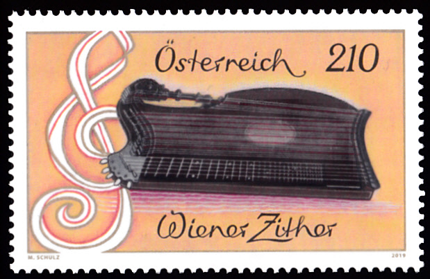 Auf dieser Marke aus Österreich (MiNr 3453) wird eine Wiener Zither gezeigt.
