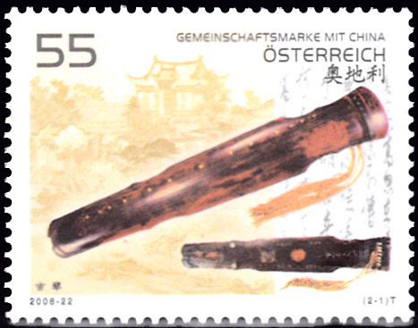 Auf einer Marke aus Österreich (MiNr 2618) sehen wir die Guqin "Da Sheng Yi Yin Qin" aus der Tang-Dynastie (618–907), sie befindet sich im Pekinger Palast-Museum, vor dem Guqintai-Monument in Wuhan.