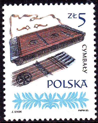 Diese Marke aus Polen (MiNr 2899) mit einem Zymbyal aus Rzeszów erschien in einer Serie "Alte Musikinstrumente".