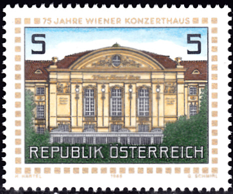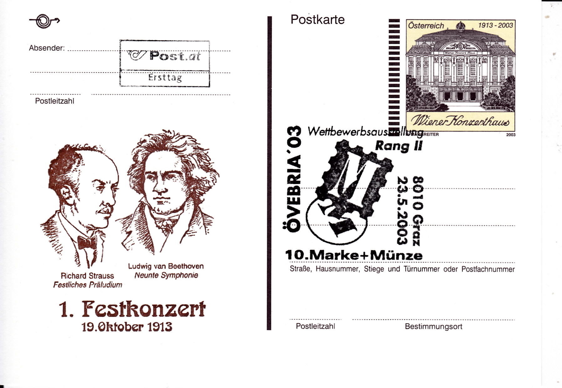 Diese Ganzsache mit Wiener Konzerthaus im Wertstempel erschien zum Jubiläum "90 Jahre Wiener Konzerthaus" und zeigt im Zudruck Ludwig von Beethoven und Richard Strauss.