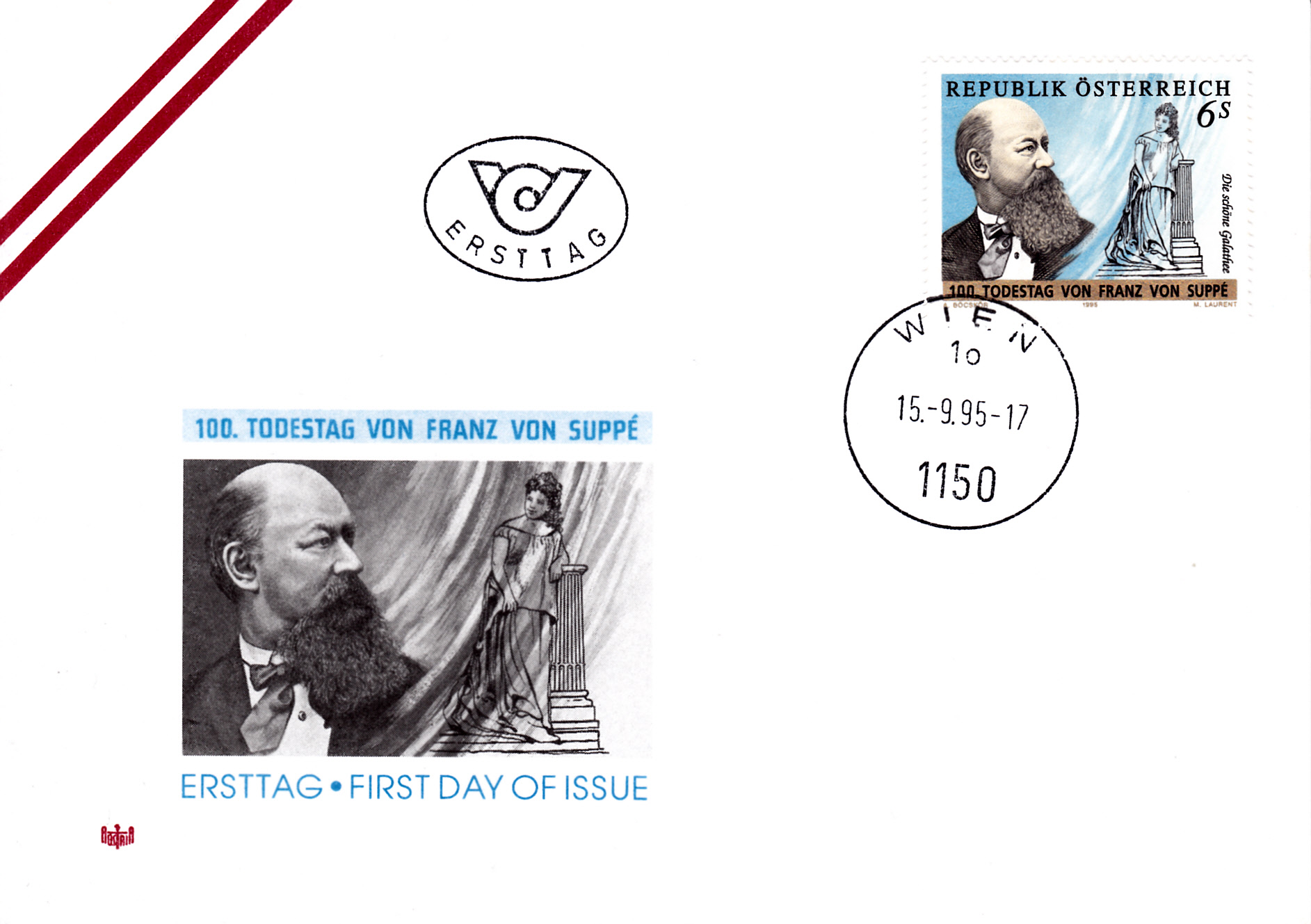 Zum 100. Todestag von Franz von Suppé ist in Österreich diese Marke (MiNr 2167) mit seinem Porträt und einer Szene aus "Die schöne Galathée" erschienen.
