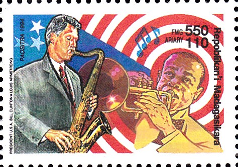 Auf einer Marke aus Madagaskar (MiNr 1762) werden Bill Clinton und Louis Armstrong gezeigt.