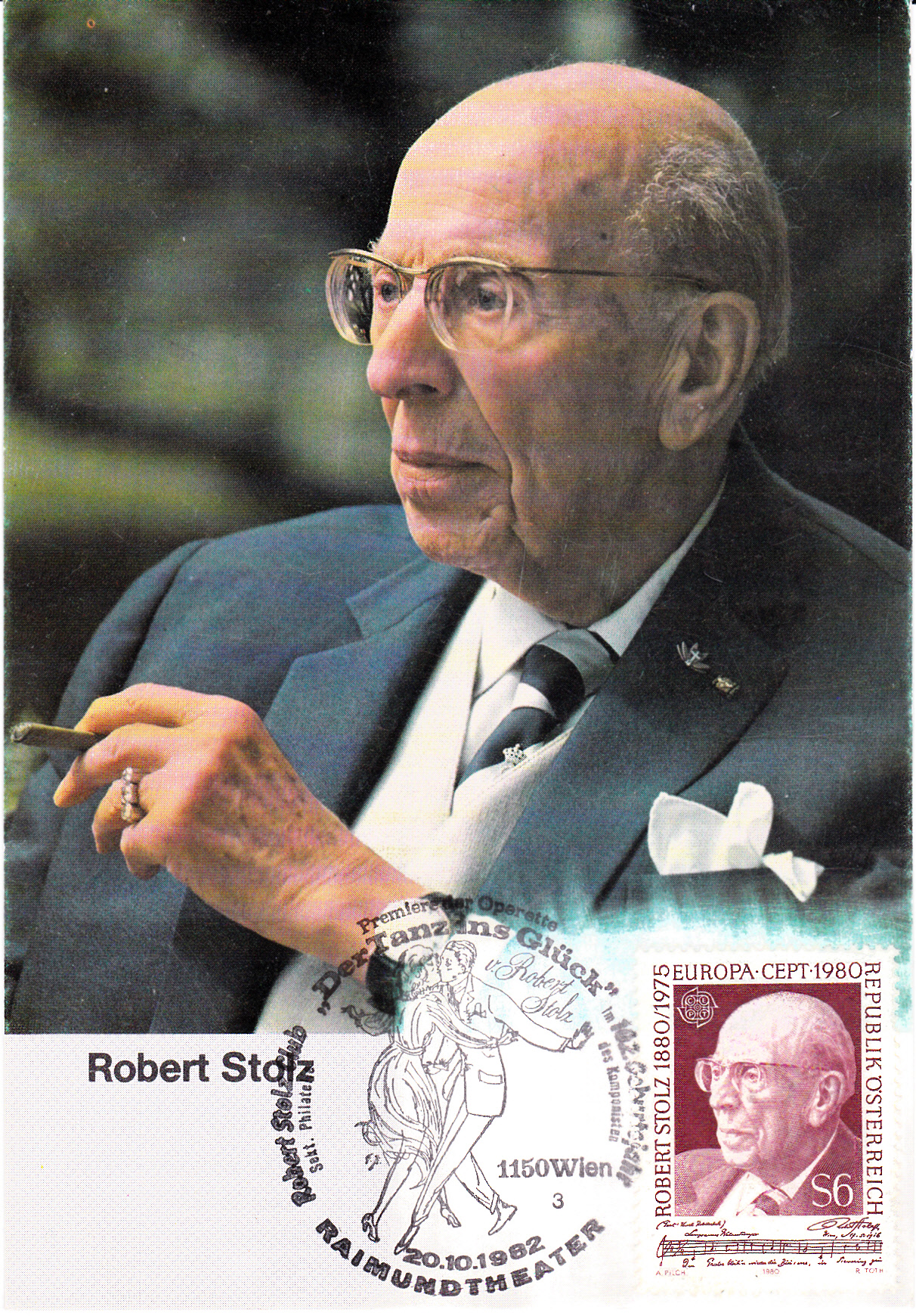 Sonderstempel aus A-1150 Wien vom 20.10.1982 Kennziffer "3" zur Premiere der Operette "Der Tanz ins Glück" (Uraufführung am 18. Oktober 1920 im Komödienhaus in Wien) von Robert Stolz im Raimund Theater Wien.