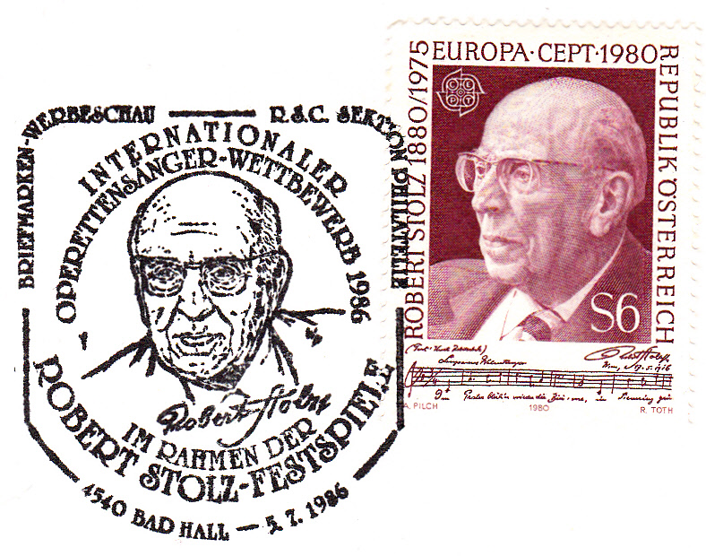 Sonderstempel aus A-4540 Bad Hall vom 5.7.1986 mit Kennziffer "1" zum Internationalen Operettensänger-Wettbewerb während der Robert Stolz-Festspielen 1986. Im Stempelbild wird ein Porträt von Robert Stolz und seine Unterschrift gezeigt.