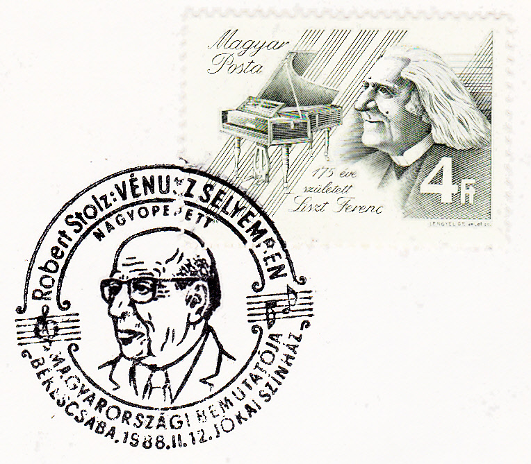 Sonderstempel aus Szombathely vom 7.10.186 zu einem Robert Stolz Konzert und Briefmarkenausstellung beim Savaria Herbstfest. (Savaria, vollständig Colonia Claudia Savaria, war eine römische Stadt auf dem Gebiet der heutigen westungarischen Stadt Szombathely.) Im Stempelbild ist auch hier wieder ein Porträt von Robert Stolz zu sehen.