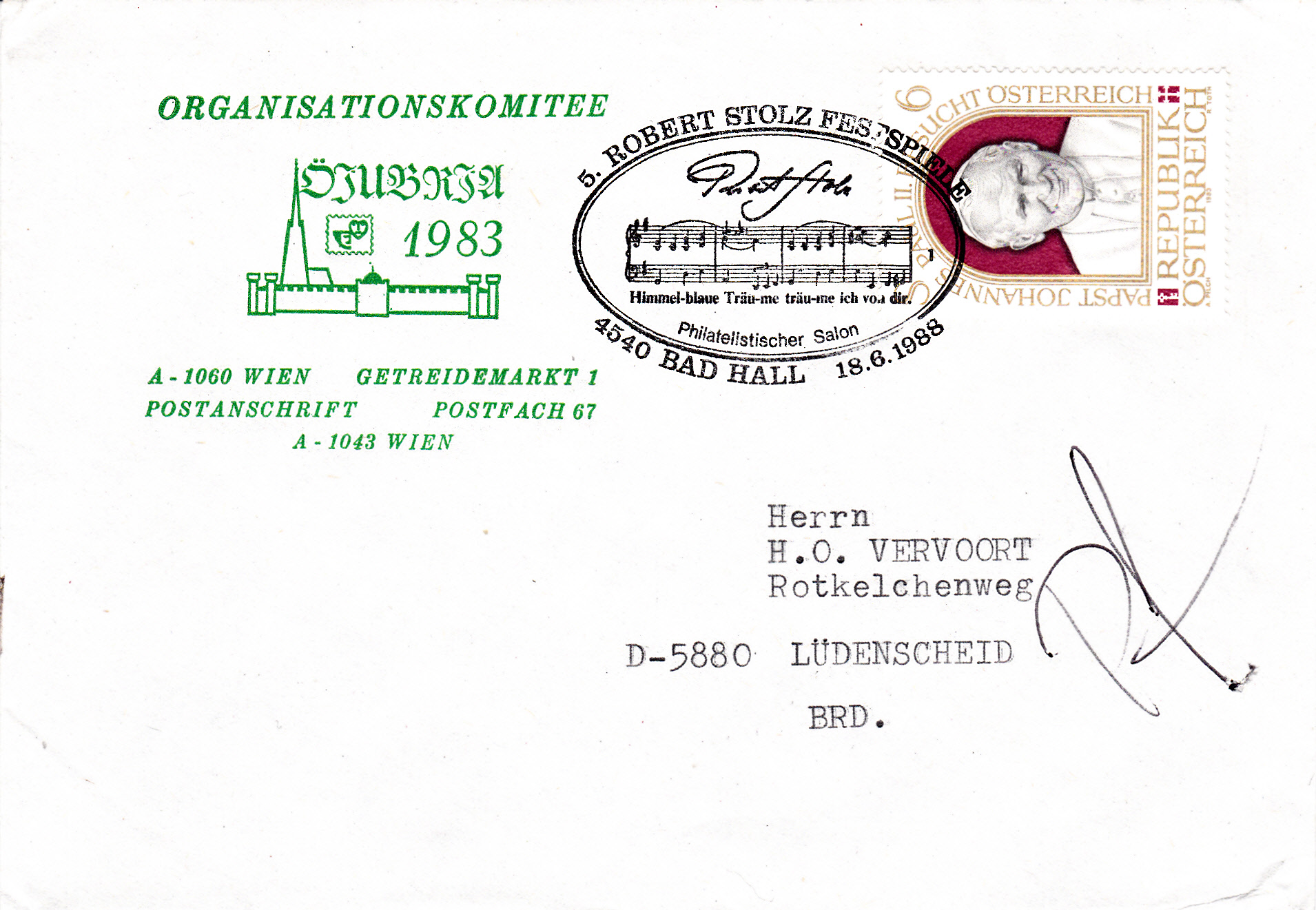 Sonderstempel vom 18.6.1988 aus Bad Hall zu den 5. Robert Stolz Festspielen.