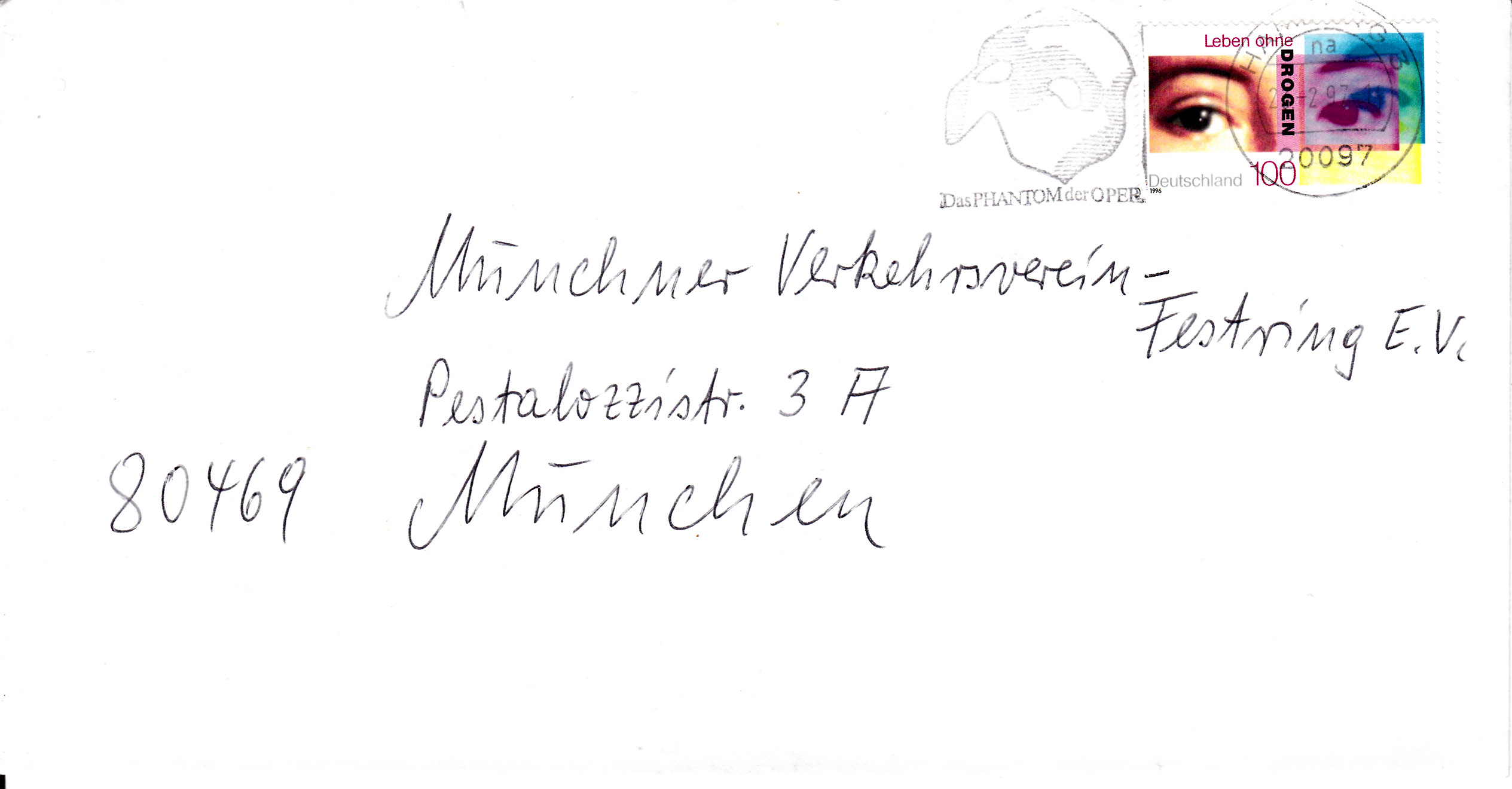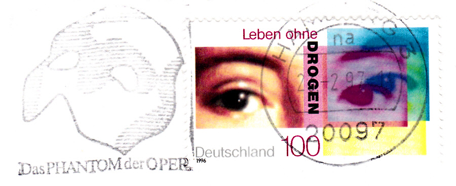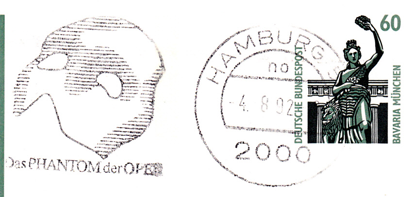 Maschinenwerbestempel aus 2050 Hamburg 80 mit Werbung für das Musical "Phantom der Oper" wie bereits im ersten Beitrag gezeigt, hier nun aber mit alter Postleitzahl.