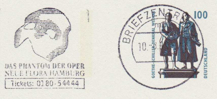 Maschinenwerbestempel mit einem neugestalteten Werbeeinsatz "Phantom der Oper / Neue Flora Hamburg" des Briefzentrums 2 vom 10.8.1999. Neu ist der Hinweis auf den Spielort "Neue Flora". Dort wurde das Phantom der Oper von 29.Juni 1990 bis zum 30.Juni 2001 aufgeführt. Es wird dort wieder seit 28.November 2013 bis zum 30. September 2015 erneut aufgeführt.