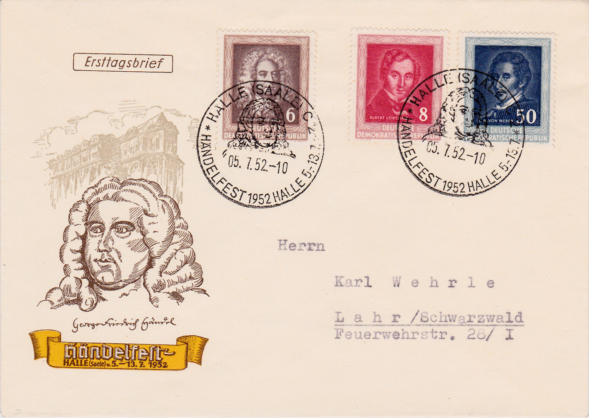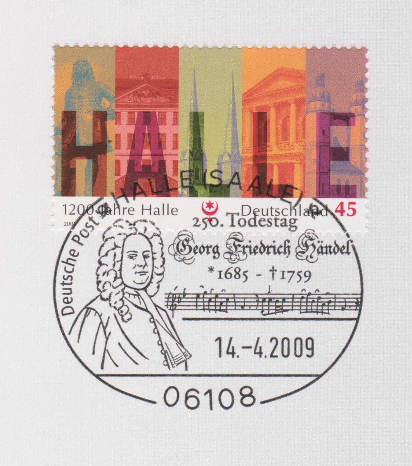 Interessant für Händel-Fans ist auch das Postwertzeichen Bundesrepublik Deutschland MiNr. 2510 "1200 Jahre Halle", denn dieses zeigt oben links das Händel-Denkmal in Halle (Saale), das einzige Denkmal in Deutschland zu Ehren des deutsch-britischen Barockkomponisten Georg Friedrich Händel: