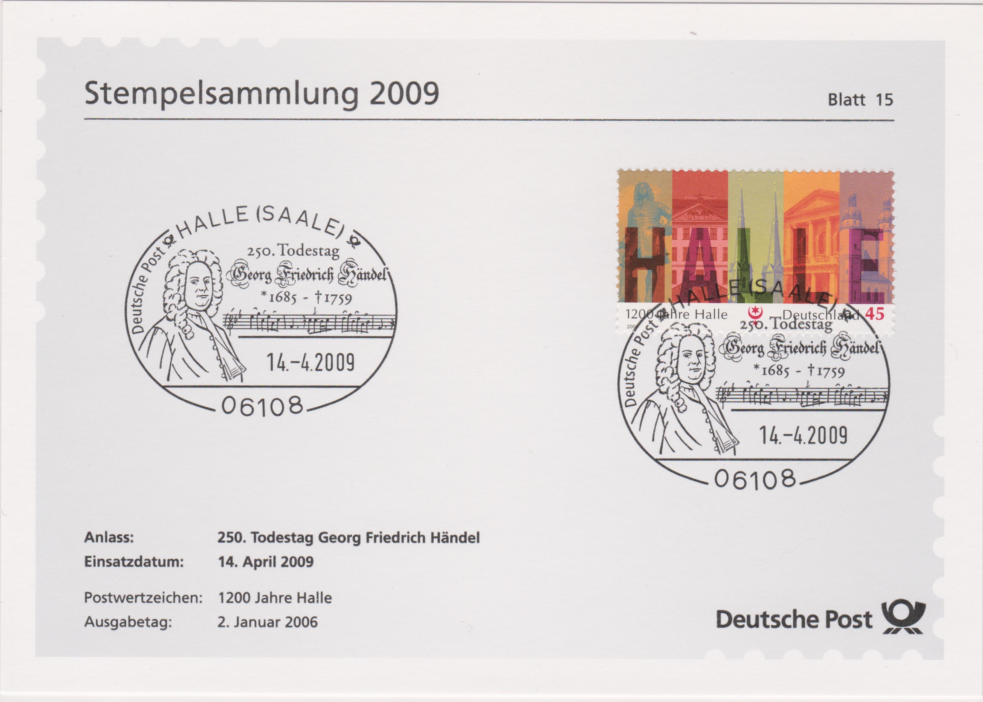 Dieses "Blatt 15" aus der "Deutsche Post Stempelsammlung 2009" zeigt einen Sonderstempel zum 250. Todestag von Georg Friedrich Händel am 14.04.2009: