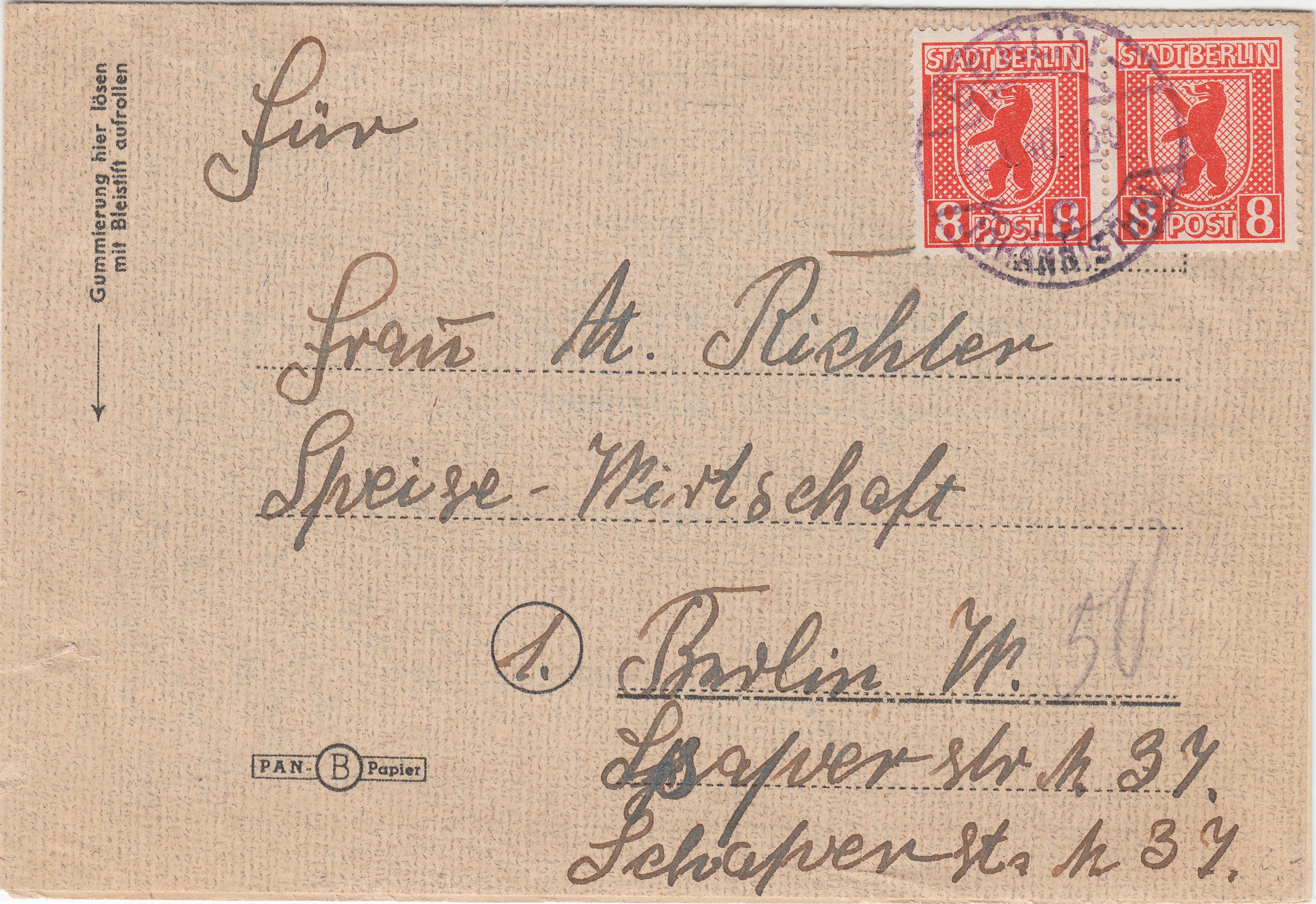 Paar der MiNr. 3 A, am 21.04.1946 portorichtig auf Ortsbrief (16 Pf) in Berlin gelaufen.