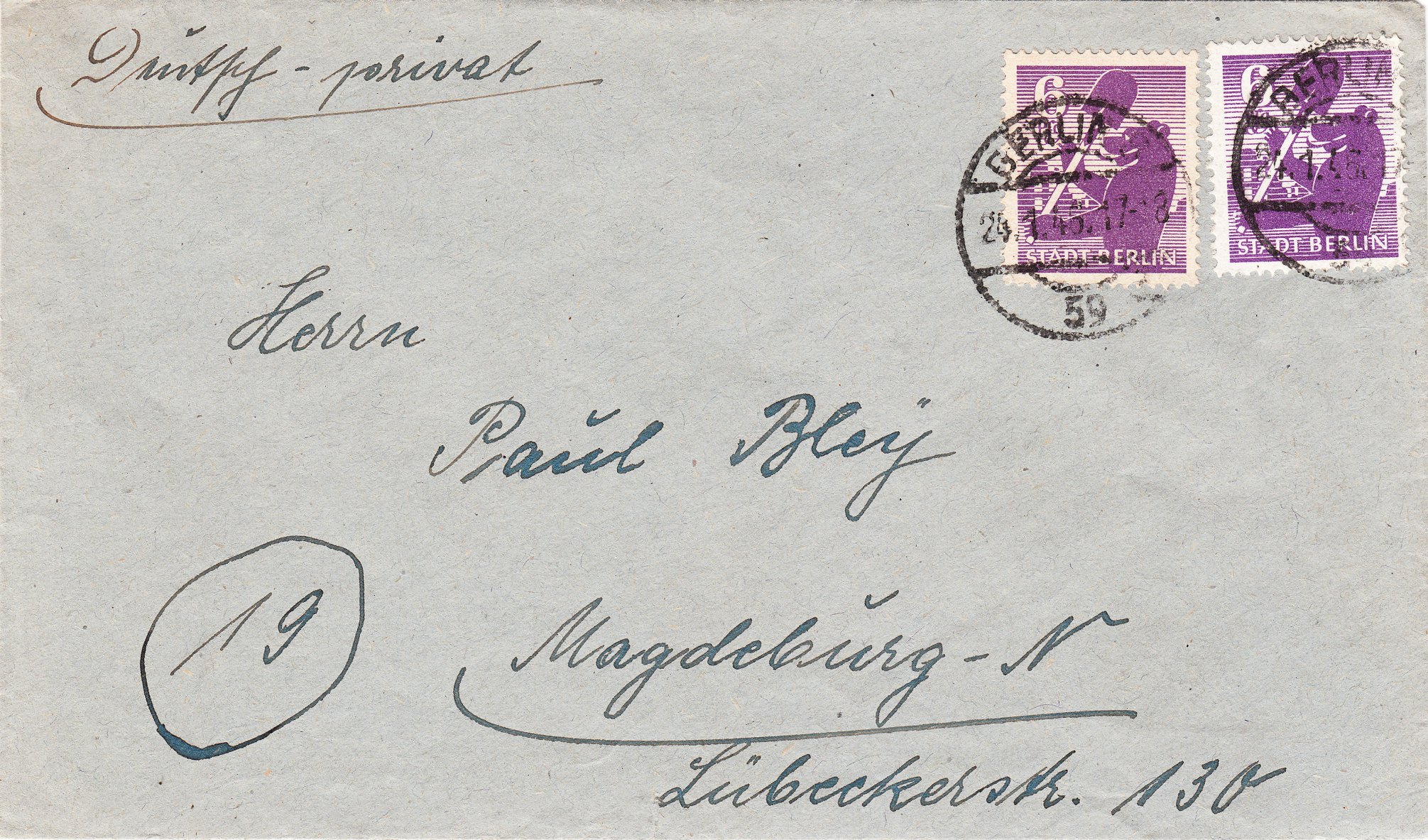 Die MiNr. 2 in zwei verschiedenen Papiersorten am 24.01.1946 als Mehrfachfrankatur portogerecht auf Fernbrief von Berlin nach Magdeburg: