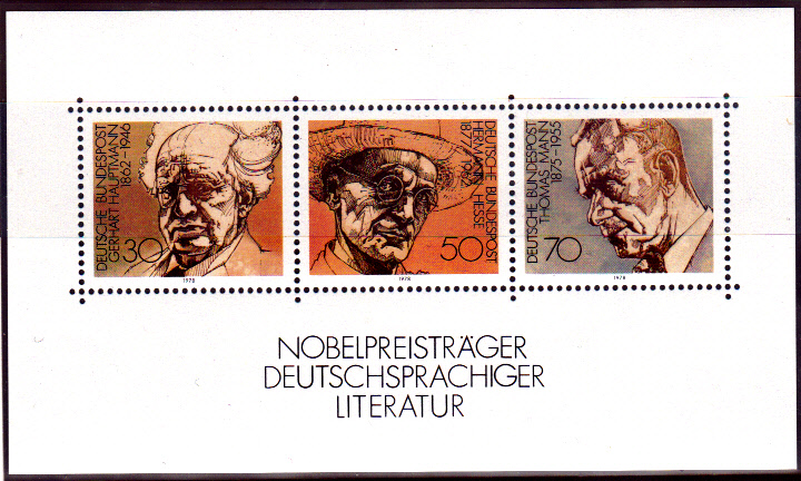 Er erhielt für seinen ersten Roman "Buddenbrooks" (1901) 1929 den Nobelpreis für Literatur. Die Deutsche Bundespost verausgabte 1978 einen Block mit Marken von Nobelpreisträgern deutschsprachiger Literatur. Der 70 Pfennigwert zeigt Thomas Mann.