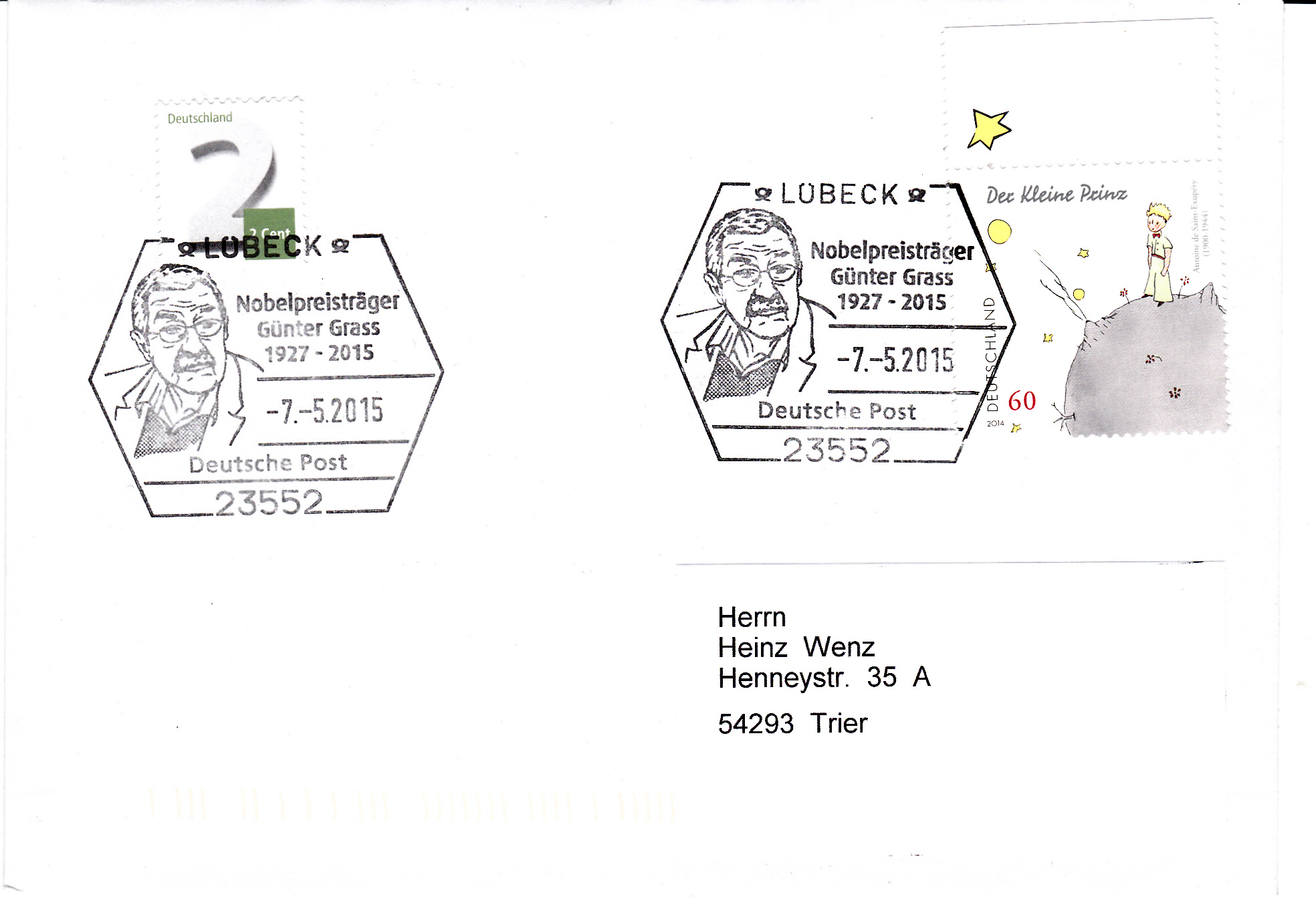 Sonderstempel aus Lübeck vom 7.5.2015 zum Tode von Günter Grass mit seinem Porträt im Stempelbild.