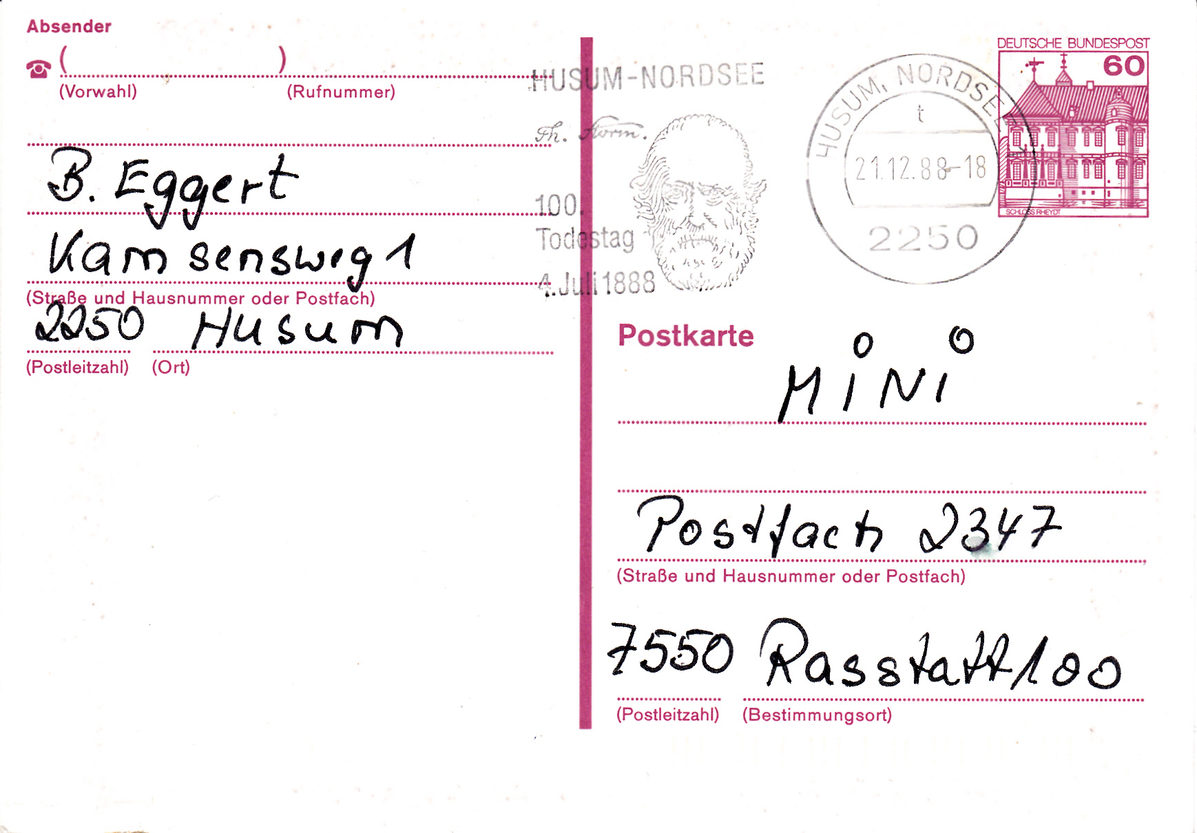 Zum 100. Todestag erschien bei der Deutschen Bundespost eine Sondermarke (MiNr 1371) mit einem Porträt von Theodor Storm.