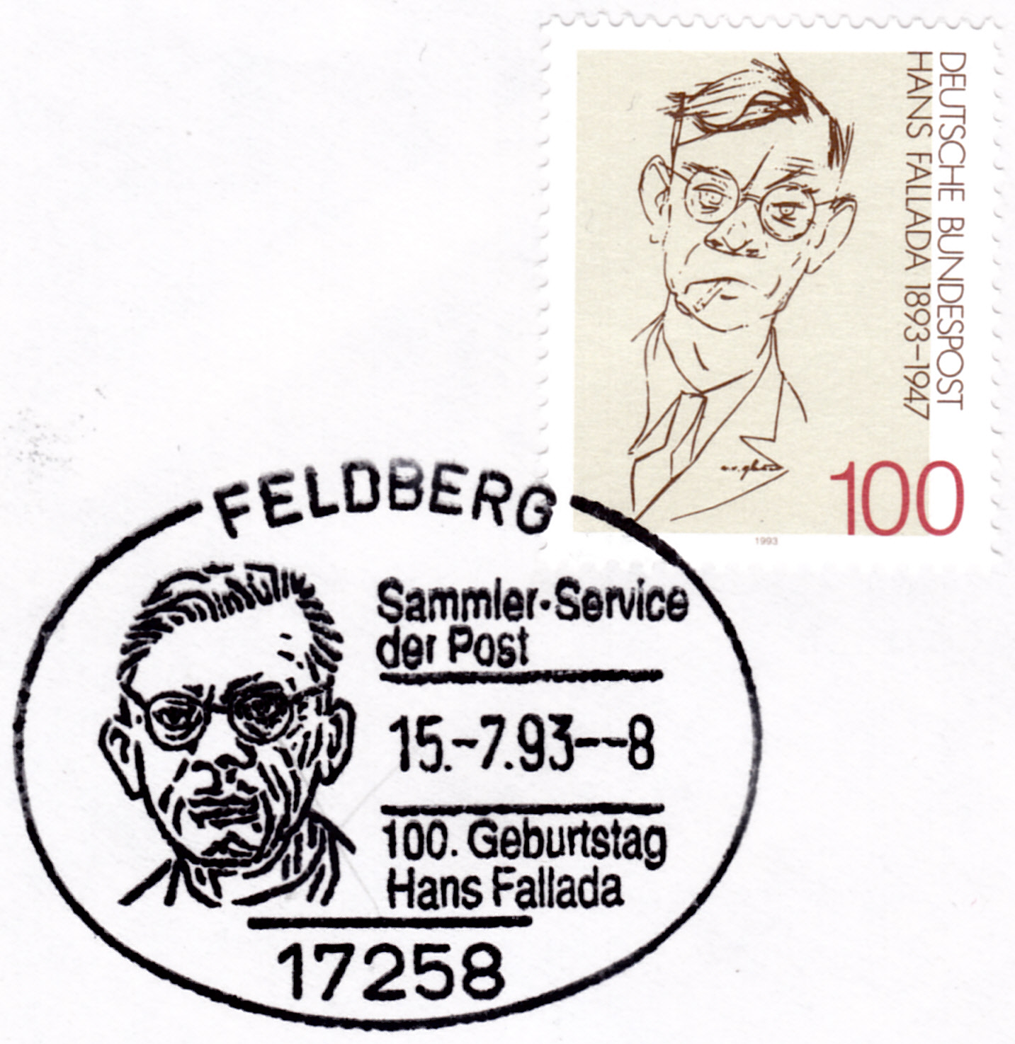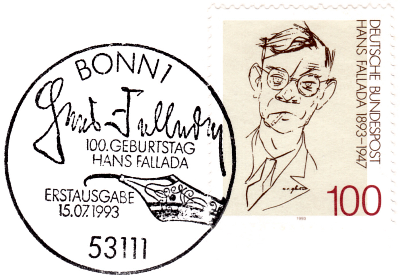 Diese Sondermarke (MiNr 1683) erschien zu seinem 100. Geburtstag. Sie zeigt Hans Fallada nach einer Porträtkarrikatur von Erich Ohser (E. O. Plauen).