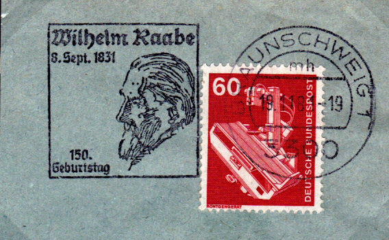 Zum 150. Geburtstag von Wilhelm Raabe erschien eine Sondermarke der Deutschen Bundespost (MiNr 1104).