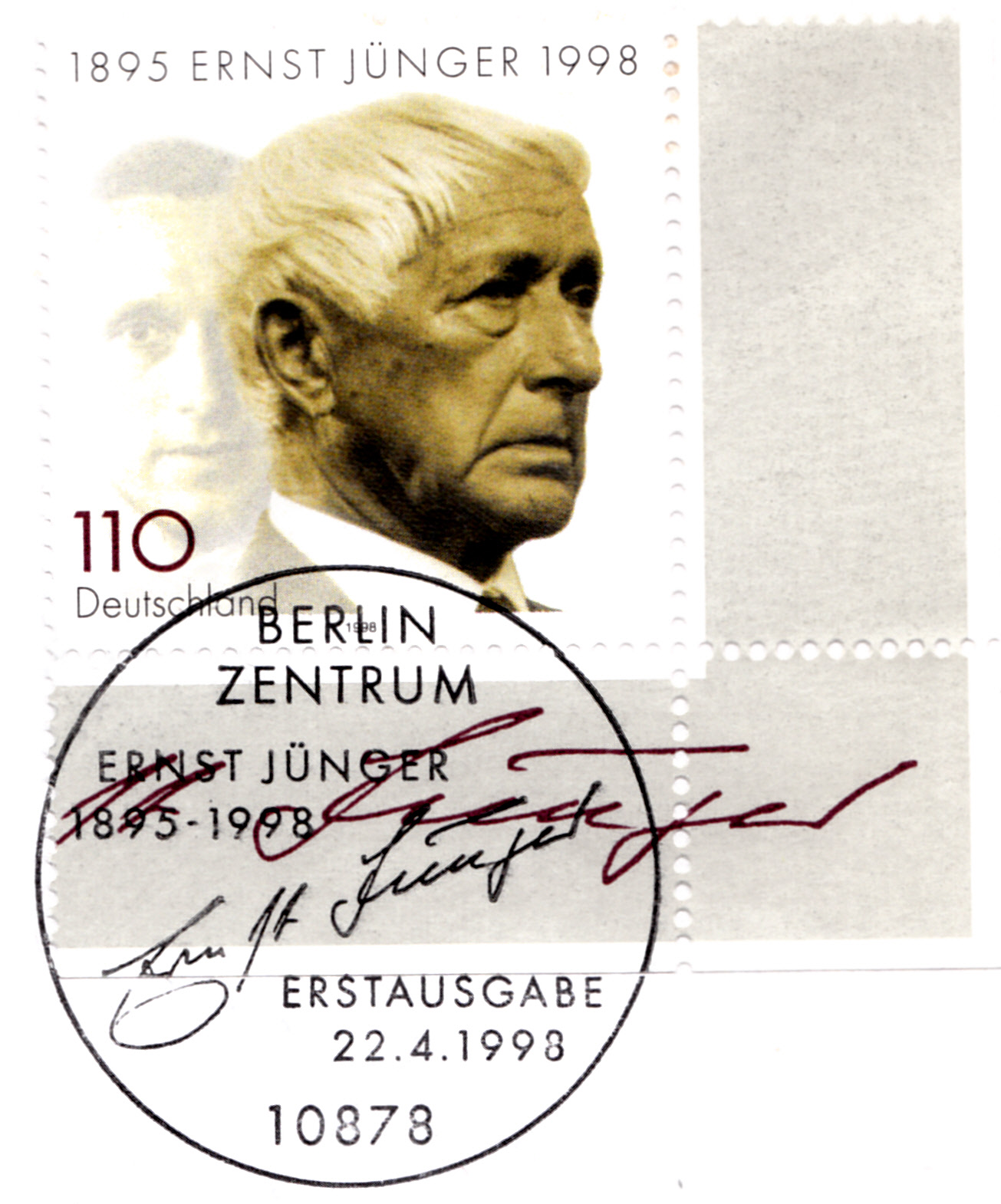 Zum Tod von Ernst Jünger ist 1998 eine Marke (MiNr 1984) mit seinem Porträt erschienen. Hier ein Eckrandstück mit dem Ersttagsonderstempel Berlin.