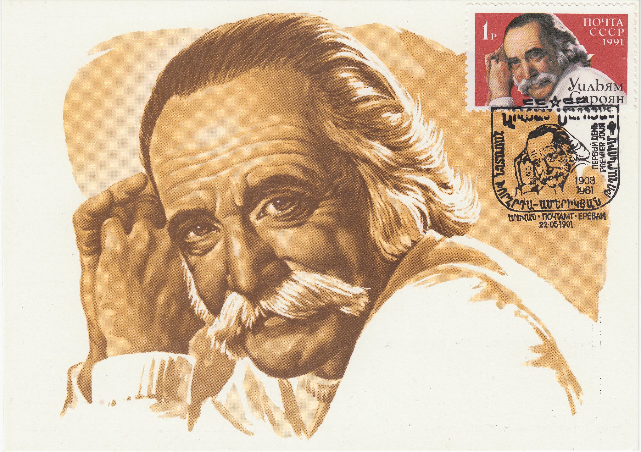 Diese Maximumkarte zeigt ein Porträt von William Saroyan sowohl auf einer Sondermarke der Sowjetunion als auch dem passenden Sonderstempel: