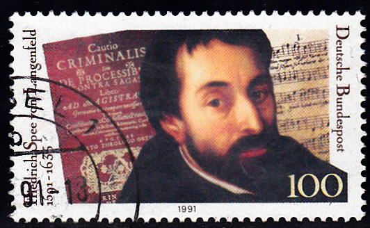Zum 400. Geburtstag von Friedrich Spee von Langenfeld gab es diese Marke (MiNr 1503) mit einem Porträt von F. Spee von Langenfeld vor dem Titel seiner Schrift "Cautio criminalis" und Noten aus seiner Liedersammlung "Trutz-Nachtigall".