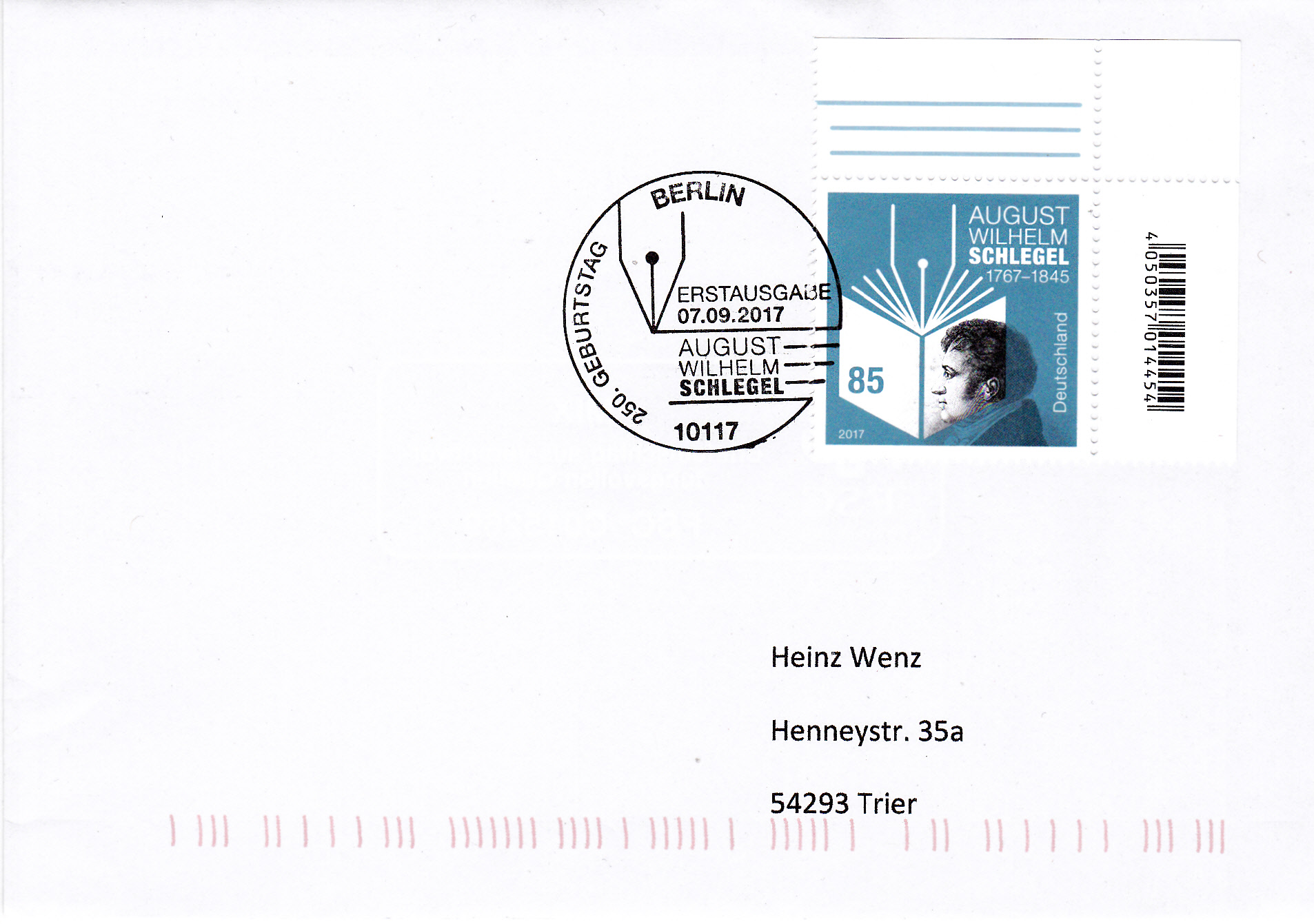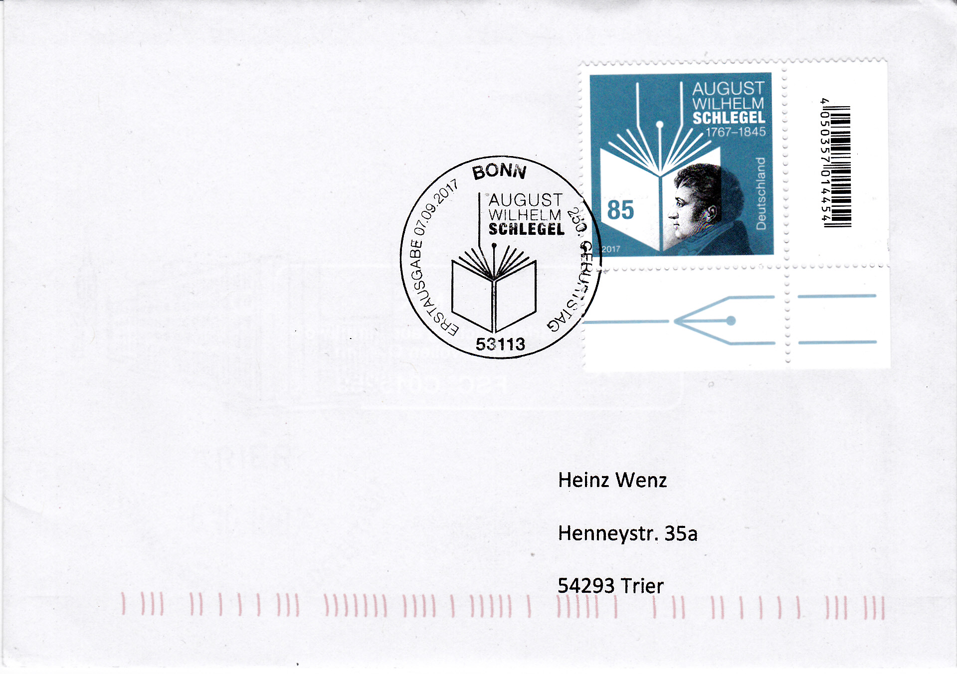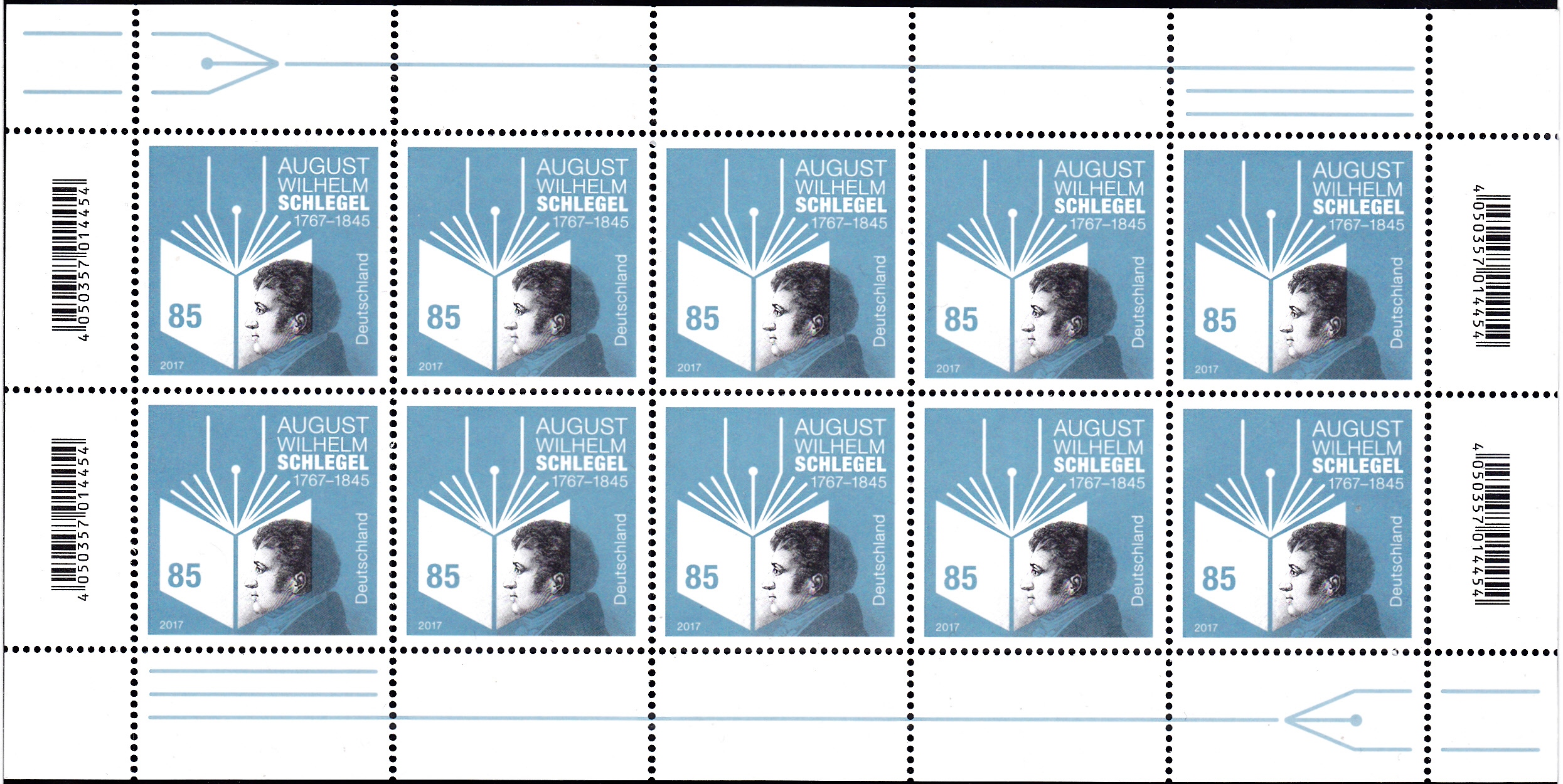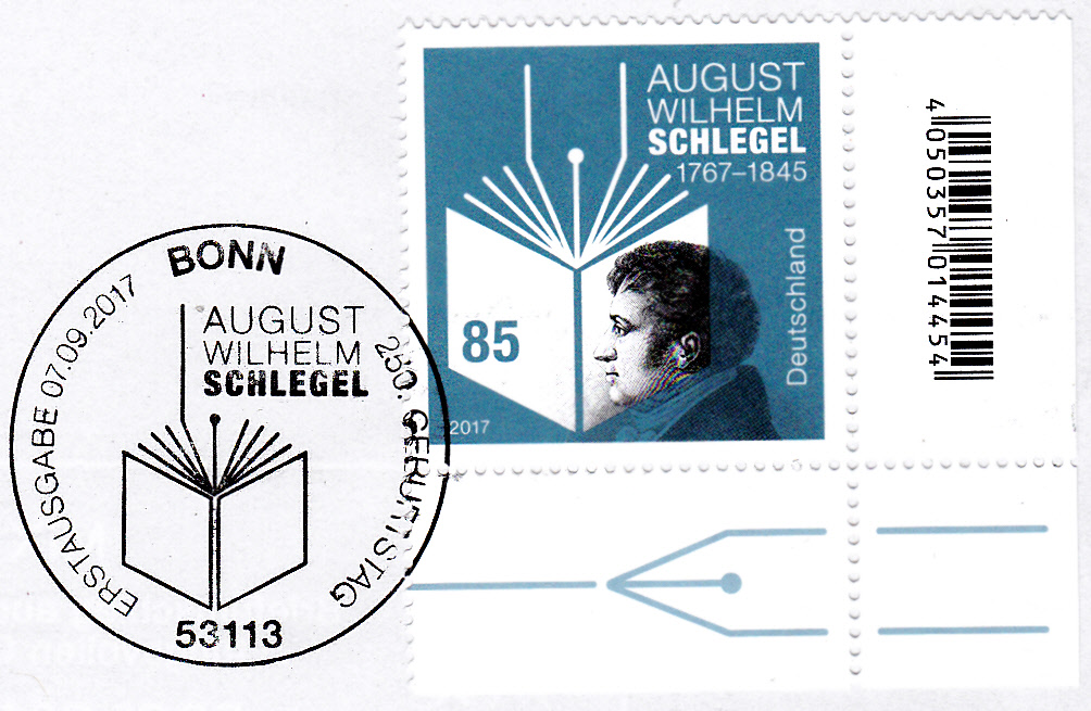 Zu seinem 250. Geburtstag erschien bei der Deutschen Post eine Marke mit seinem Porträt vor einem aufgeschlagenen Buch. Hier ein Eckrandstück mit EAN-Code.