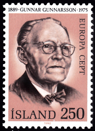Auf der Europamarke 1980 zu 250 Kronen aus Island (MiNr 553) wird ein Porträt von Gunnar Gunnarsson gezeigt.
