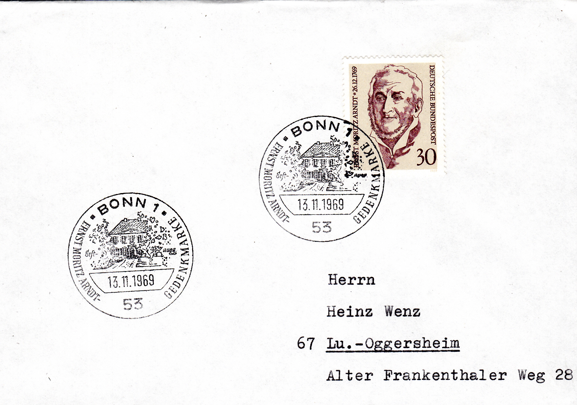 Hier ein blanko gestempelter FDC dieser Sondermarke mit ESST Bonn, der das von Ernst Moritz Arndt bewohnte Haus in Bonn zeigt: